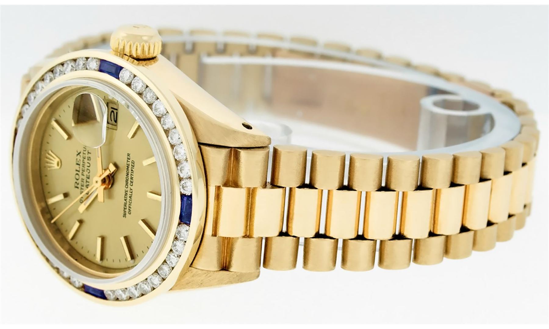 One Ladies 18K Yellow Gold Pre Owned Rolex Presidential Polished, Serviced & Electronically Tested, Rolex 18K Yellow Gold Case: 26mm, Rolex 18K Yellow Gold Crown, Custom Bezel: New 18K Yellow Gold Sapphire Channel Set Diamond Bezel, Diamond + Stone Count: 36 Diamonds + 4 Sapphires. Total Weight 1.00 Carat, Clarity: SI-VS, Color: G to H. Custom Crystal: New Scratch Resistant Synthetic Sapphire Cyclops Lens. Custom Hands: New Luminescent Hands. Rolex Movement: Automatic Winding Movement. Rolex Dial: Champagne Index With Dash Track & Lumi Dots. Date Window: 3 O'Clock Position, Model: Datejust Presidential, Condition: G-6 Extra Fine. Rolex Bracelet: 18K Yellow Gold President With Hidden Clasp, Bright & Satin Polish. 6.0 Inch Length, Standard President Clasp (Hidden Clasp), With Rolex Logo. Watch Has Been Serviced And Polished It Is Free Of All Scratches And Dents. This Watch Has Been Serviced Time Tested And Is In Excellent Condition It Is Free Of All Scratches And Dents.