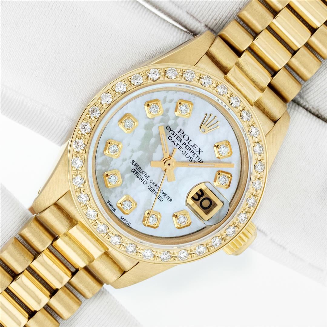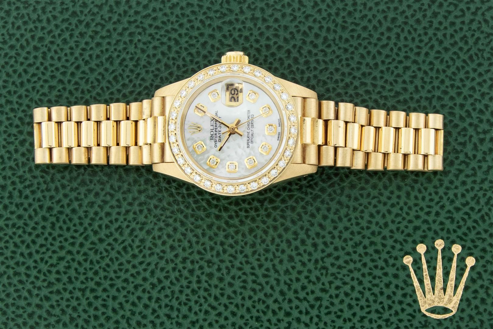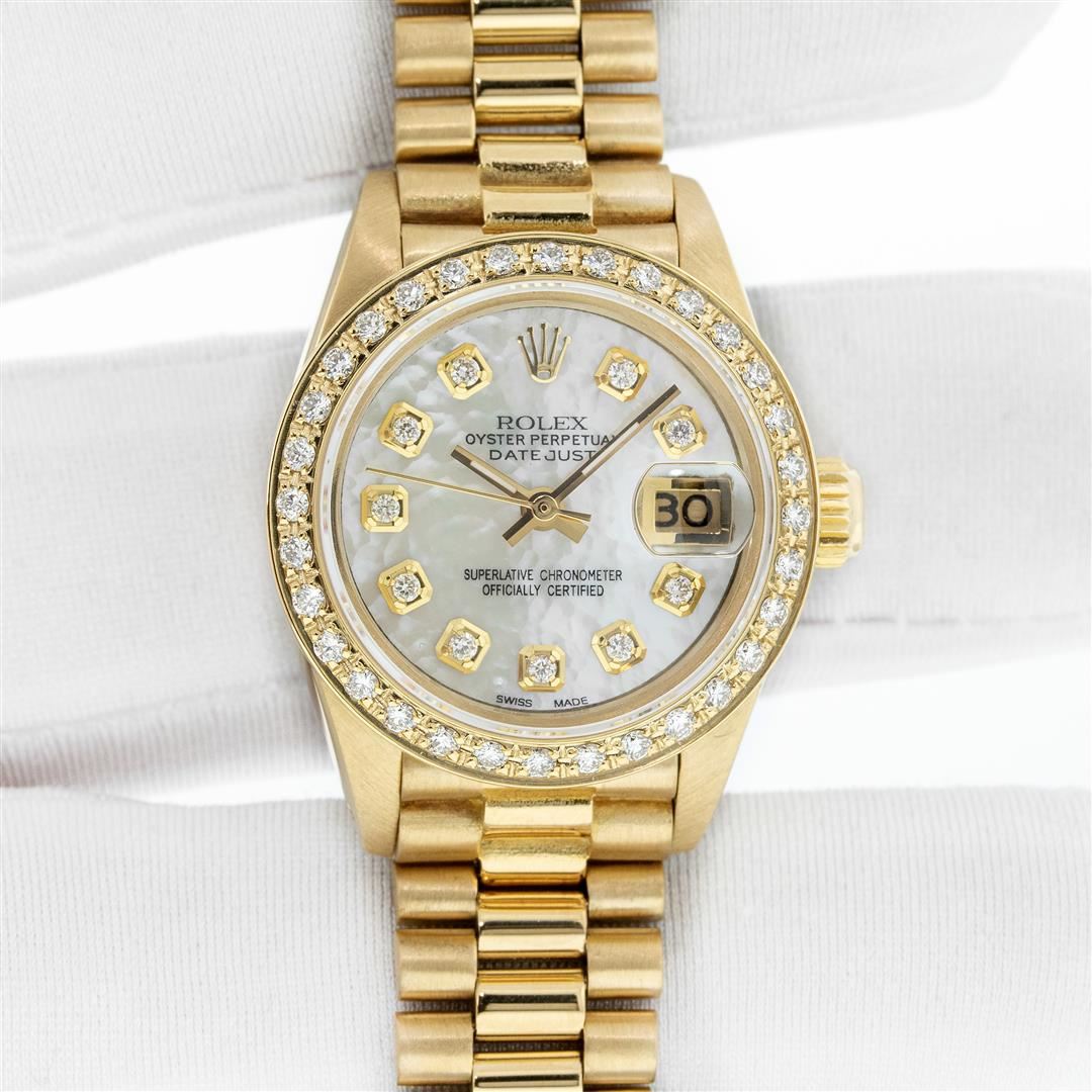 One Ladies Rolex 18K Yellow Gold President Polished, Serviced & Electronically Tested, Rolex 18K Yellow Gold Case: 26mm, Rolex 18K Yellow Gold Crown, Custom Bezel: New 18K Yellow Gold Bead Set Diamond Bezel, Diamond Count: 32 Diamonds, Clarity: SI-VS, Color: G to H. Custom Crystal: New Sapphire With Magnified Date Window. Rolex Movement: Automatic Winding Movement. Custom Dial: Mother Of Pearl With Diamond Dial, Color: G to H, Diamond Count: 10 Diamonds In Dial, Clarity: SI-VS. Date Window: 3 O'clock Position, Model: Datejust. Condition: G-6 Extra Fine The Watch Is In Very Good Condition Free Of All Scratches And Dents. Rolex Bracelet: 18K Yellow Gold President Band, Bright & Satin Polish. 6.0 Inch Length, Standard President Clasp (Hidden Clasp). This Pre Owned Watch Has Been Serviced And Polished It Is Free Of All Scratches And Dents. This Watch Comes With A Rolex Box.