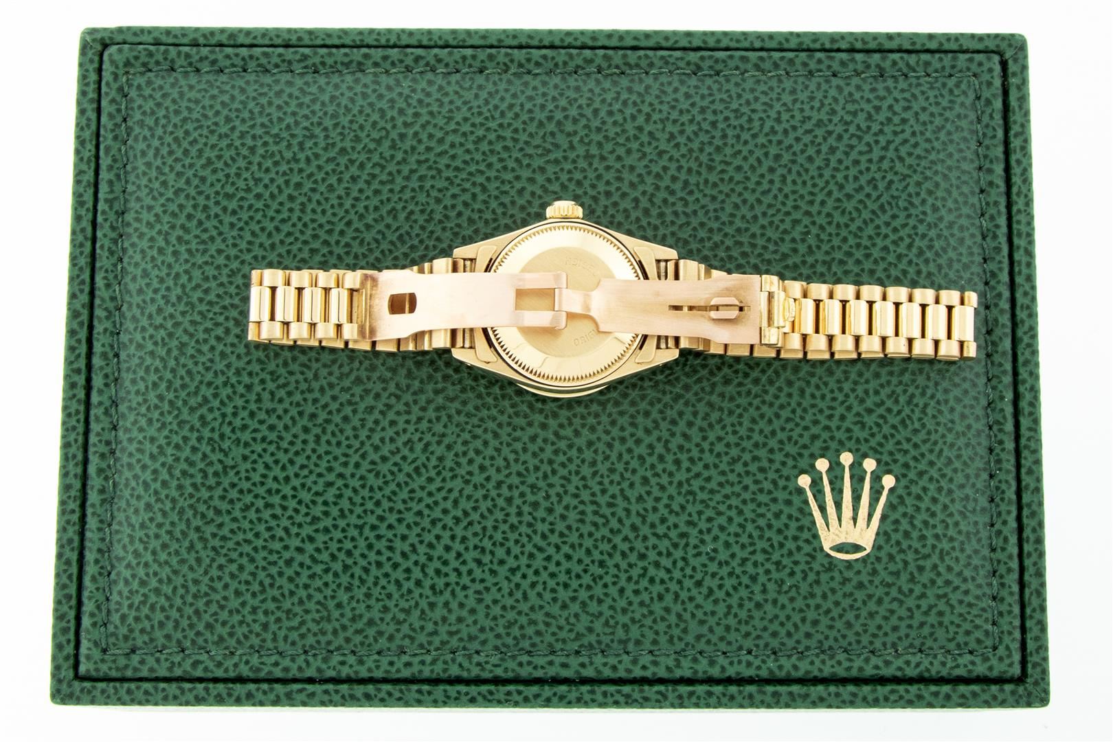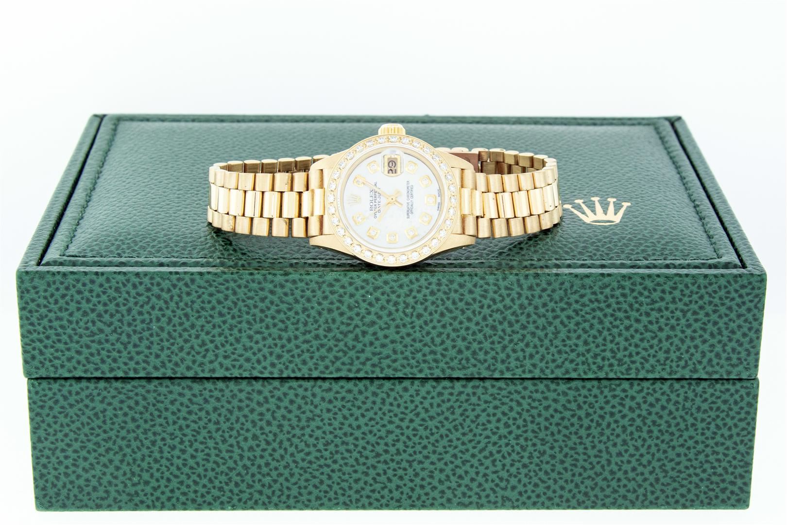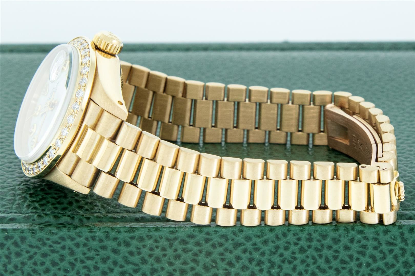 One Ladies Rolex 18K Yellow Gold President Polished, Serviced & Electronically Tested, Rolex 18K Yellow Gold Case: 26mm, Rolex 18K Yellow Gold Crown, Custom Bezel: New 18K Yellow Gold Bead Set Diamond Bezel, Diamond Count: 32 Diamonds, Clarity: SI-VS, Color: G to H. Custom Crystal: New Sapphire With Magnified Date Window. Rolex Movement: Automatic Winding Movement. Custom Dial: Mother Of Pearl With Diamond Dial, Color: G to H, Diamond Count: 10 Diamonds In Dial, Clarity: SI-VS. Date Window: 3 O'clock Position, Model: Datejust. Condition: G-6 Extra Fine The Watch Is In Very Good Condition Free Of All Scratches And Dents. Rolex Bracelet: 18K Yellow Gold President Band, Bright & Satin Polish. 6.0 Inch Length, Standard President Clasp (Hidden Clasp). This Pre Owned Watch Has Been Serviced And Polished It Is Free Of All Scratches And Dents. This Watch Comes With A Rolex Box.