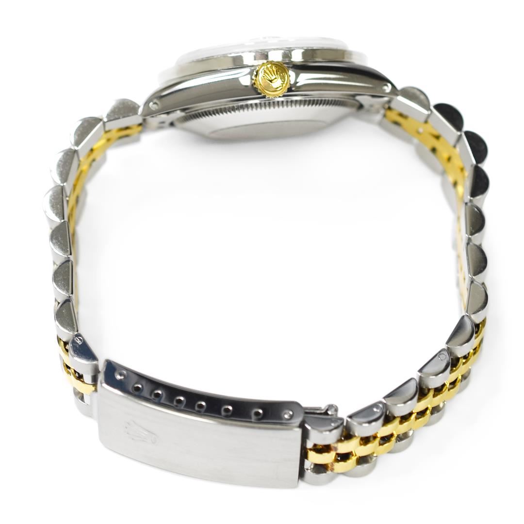 Rolex Lady Datejust 18KT Yellow Gold & Stainless Steel 31mm Mother of Pearl Diamond Dial Watch Polished & Electronically Tested. Model: Datejust. Case: 18KT Yellow Gold & Stainless Steel. Bezel: Custom made diamond bezel with round brilliant diamonds all set in prong setting. Total Diamond Weight: 0.85ctw. Clarity: VS-SI Color: G-H. Crystal: Sapphire Crystal. Bracelet: 18KT Yellow Gold & Stainless Steel, Adjustable Standard Clasp with Rolex Logo, Loose. Dial: Mother of Pearl Diamond Dial. Date Window: 3 O'clock Position. Movement: Automatic Winding Movement. Water Resistant: Yes. Case Size: 31mm. Condition: Pre Owned, Watch is free of all Scratches and Dents, Extra Fine G-6.