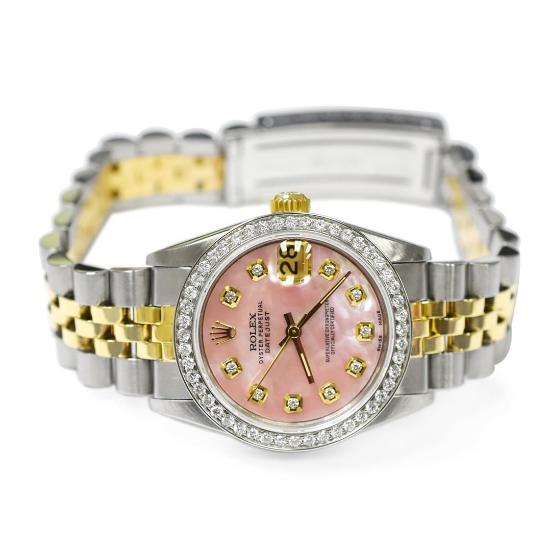 Rolex Lady Datejust 18KT Yellow Gold & Stainless Steel 31mm Mother of Pearl Diamond Dial Watch Polished & Electronically Tested. Model: Datejust. Case: 18KT Yellow Gold & Stainless Steel. Bezel: Custom made diamond bezel with round brilliant diamonds all set in prong setting. Total Diamond Weight: 0.85ctw. Clarity: VS-SI Color: G-H. Crystal: Sapphire Crystal. Bracelet: 18KT Yellow Gold & Stainless Steel, Adjustable Standard Clasp with Rolex Logo, Loose. Dial: Mother of Pearl Diamond Dial. Date Window: 3 O'clock Position. Movement: Automatic Winding Movement. Water Resistant: Yes. Case Size: 31mm. Condition: Pre Owned, Watch is free of all Scratches and Dents, Extra Fine G-6.