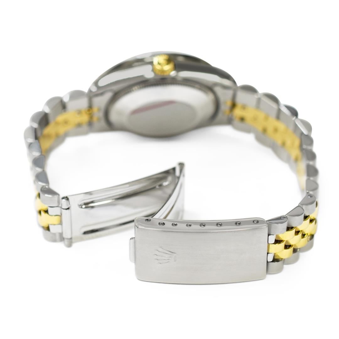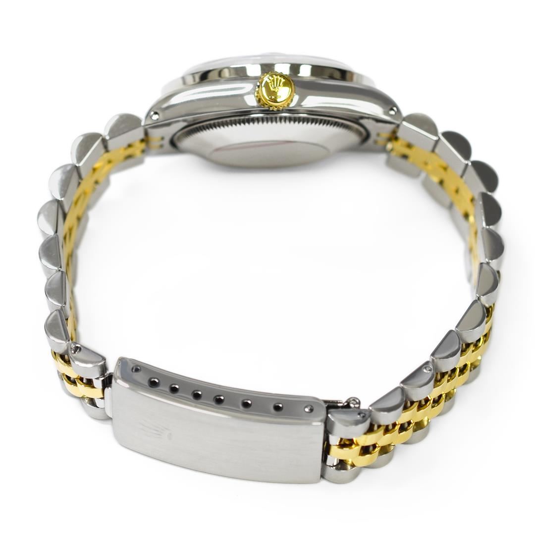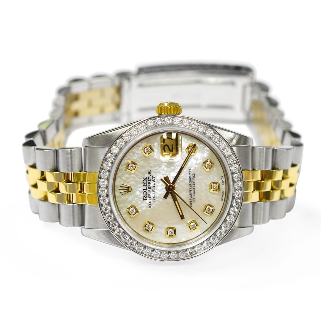 Rolex Lady Datejust 18KT Yellow Gold & Stainless Steel 31mm Mother of Pearl Diamond Dial Watch Polished & Electronically Tested. Model: Datejust. Case: 18KT Yellow Gold & Stainless Steel. Bezel: Custom made diamond bezel with round brilliant diamonds all set in prong setting. Total Diamond Weight: 0.85ctw. Clarity: VS-SI Color :G-H. Crystal: Sapphire Crystal. Bracelet: 18KT Yellow Gold & Stainless Steel, Adjustable Standard Clasp with Rolex Logo, Loose. Dial: Mother of Pearl Diamond Dial. Date Window: 3 O'clock Position. Movement: Automatic Winding Movement. Water Resistant: Yes. Case Size: 31mm. Condition: Pre Owned, Watch is free of all Scratches and Dents, Extra Fine G-6.
