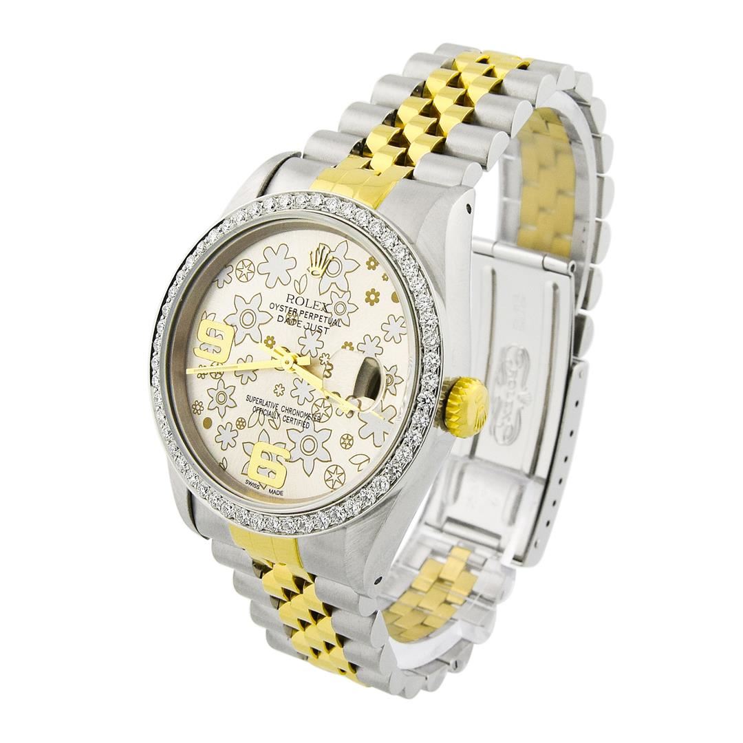 Rolex Lady Datejust 18KT Yellow Gold & Stainless Steel 36mm Silver Floral Dial Watch Polished & Electronically Tested. Model: Datejust. Case: 18KT Yellow Gold & Stainless Steel. Crystal: Sapphire Crystal. Bracelet: 18KT Yellow Gold & Stainless Steel, Adjustable Standard Clasp with Rolex Logo, Loose. Dial: Silver Floral Dial . Date Window: 3 O'clock Position. Movement: Automatic Winding Movement. Water Resistant: Yes. Case Size: 36mm. Condition: Pre Owned, Watch is free of all Scratches and Dents, Near Mint G-7.