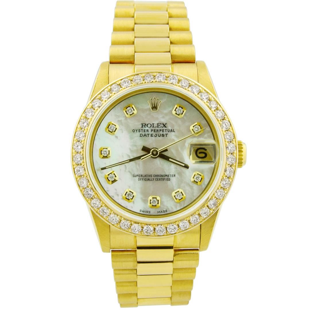 Rolex Datejust President Lady 31mm MOP Diamond Dial 18KT Yellow Gold Polished & Electronically Tested. Model: Datejust President 68278. Case: 18KT Yellow Gold. Bezel: Custom made diamond bezel with round brilliant diamonds all set in prong setting. Total Weight 0.85ctw Clarity: VS-SI Color:G-H. Crystal: Sapphire. Bracelet: 18KT Yellow Gold, Little Loose. Dial: Mother of Pearl With 0.10 Diamonds. Date Window: 3 O'clock Position date display. Movement: Automatic Winding Movement. Water Resistant: Yes. Case Size: 31mm. Condition: Pre Owned, Watch is free of all Scratches and Dents, Extra Fine G-6.