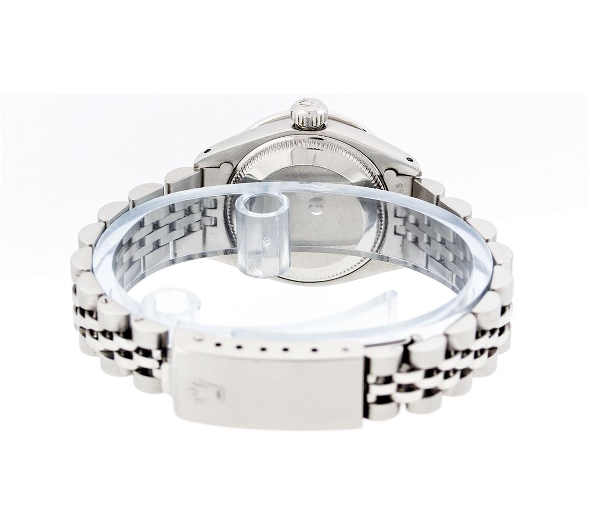 One Ladies Rolex Datejust Polished Bright with Satin Finish, Serviced & Electronically Tested, Stainless Steel Case:26mm, Stainless Steel Crown, Custom Bezel: 18K White Gold Emerald Beadset Diamond Bezel, Diamond + Gem Count: 28 Diamonds + 4 Emeralds. Total Weight .70 Carat, Clarity: SI-VS, Color: G to H. Custom Crystal: Synthetic Sapphire Cyclops Lens. Movement: Automatic Winding Movement Caliber 2030. Custom Dial: Refinished Mother Of Pearl With Diamond Hour Markers, 10 Diamond in Dial G To H In Color, Clarity: SI-VS. Date Window: 3 O'Clock Position Date Display, Model: Datejust. Condition: G-6 Extra Fine. Bracelet: Stainless Steel Jubilee. Bright Polish & Satin Finish. 6.0 Inch Length, Adjustable. Standard Clasp, With Rolex Logo.