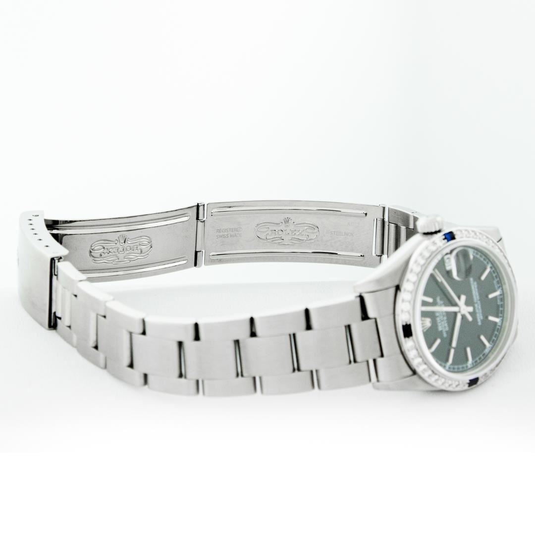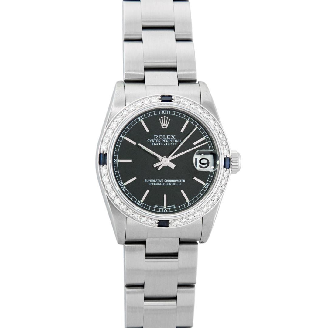 One Women's Midsize Stainless Steel Rolex Datejust Polished, Serviced & Electronically Tested, Rolex Stainless Steel Case : 31mm, Rolex Stainless Steel Crown, Custom Bezel: New 18K White Gold Sapphire Beadset Diamond Bezel, Diamond Count: 40 Diamonds + 4 Sapphires On Bezel, Color: G To H, Clarity: VS2-SI1. Custom Crystal: New Sapphire With Magnified Date Window. Custom Hands: New Luminescent Hands. Rolex Movement: Automatic Winding Movement 2235. Rolex Dial: Black Index Dial With Square Roman Track, Date Window: 3 O'Clock Position Date Display, Quickset, Model: Midsize Quickset Datejust. Condition: G-6 Extra Fine. Rolex Bracelet: Stainless Steel Oyster Band. Bright Polish. 6.0 Inch Length, Adjustable. Standard Clasp, With Rolex Logo. This Pre Owned Watch Has Been Serviced Time Tested And Is In Excellent Condition It Is Free Of All Scratches And Dents.