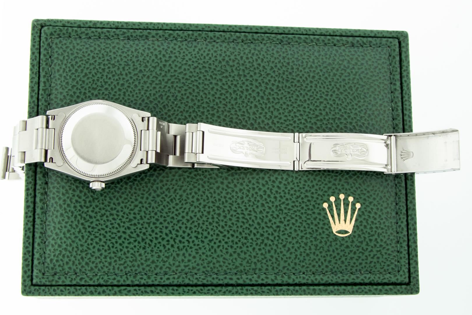 One Women's Pre Owned Midsize Stainless Steel Rolex Datejust Polished, Serviced & Electronically Tested, Rolex Stainless Steel Case Case: 31mm, Rolex Stainless Steel Crown, Custom Bezel: New 18K White Gold Sapphire Beadset Diamond Bezel, Diamond Count: 40 Diamonds + 4 Sapphires On Bezel, Color: G To H, Clarity: VS2-SI1. Custom Crystal: New Sapphire With Magnified Date Window. Custom Hands: New Luminescent Hands. Rolex Movement: Automatic Winding Movement 2235. Rolex Dial: Black Index Dial, Date Window: 3 O'Clock Position Date Display, Quickset, Model: Midsize Datejust. Condition: G-6 Extra Fine. Rolex Bracelet: Stainless Steel Oyster Band. Bright Polish. 6.0 Inch Length, Adjustable. Standard Clasp, With Rolex Logo. This Watch Has Been Serviced Time Tested And Is In Excellent Condition It Is Free Of All Scratches And Dents. This Watch Comes With A Rolex Box.