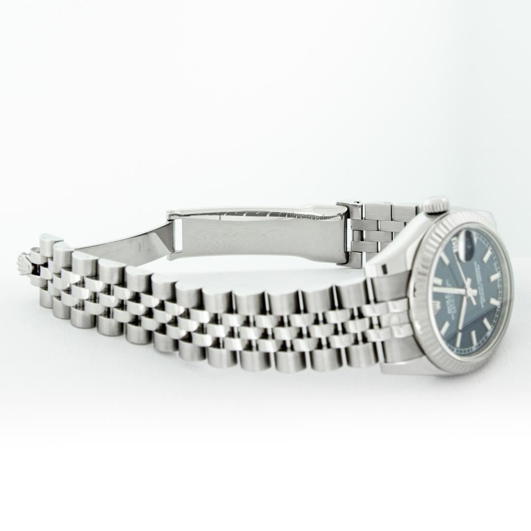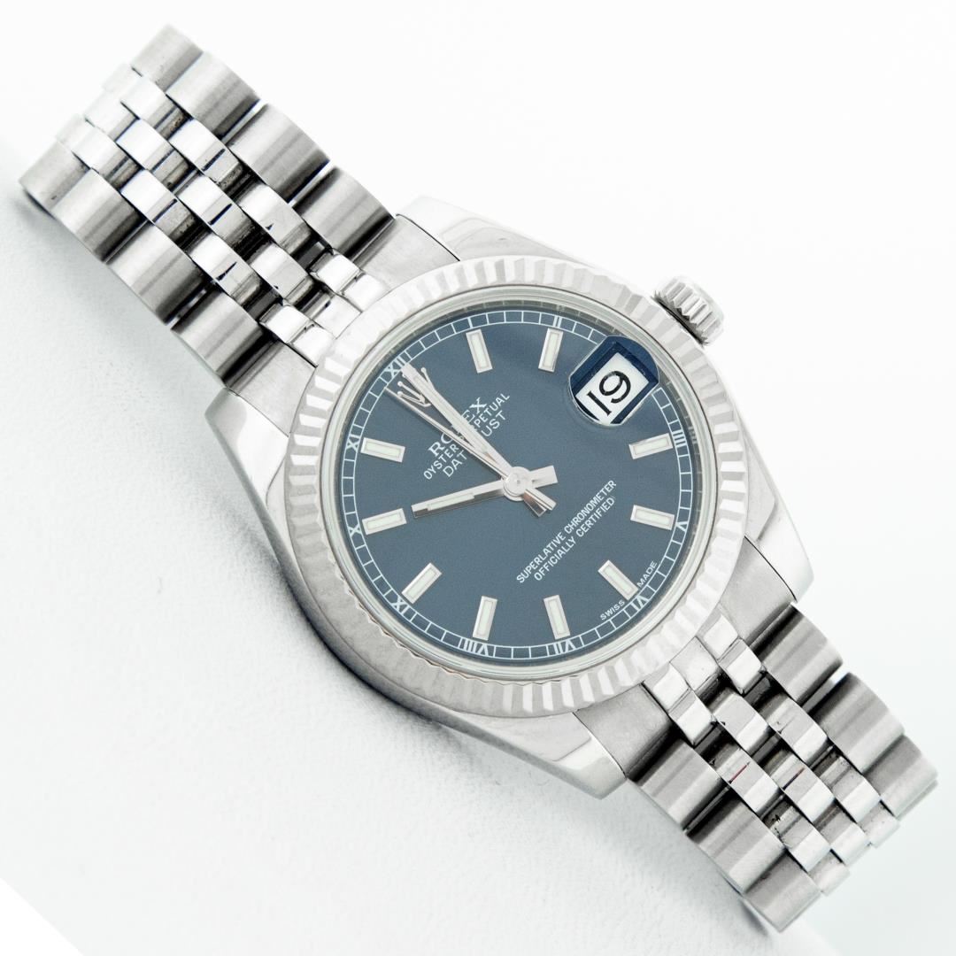 One Women's Midsize Stainless Steel Rolex Datejust Polished, Serviced & Electronically Tested, Stainless Steel Case : 31mm, Stainless Steel Crown, Bezel: 18K White Gold Fluted Bezel, Crystal: Sapphire With Magnified Date Window. Hands: Luminescent Hands. Rolex Movement: Automatic Winding Movement Caliber 2235. Rolex Dial: Blue Index Dial With Square Roman Track, Date Window: 3 O'Clock Position Date Display, Quickset, Model: Sapphire Quickset Midsize Datejust. Condition: G-6 Extra Fine. Rolex Bracelet: Stainless Steel Jubilee Band With Hidden Clasp. Bright Polish. 6.0 Inch Length, Adjustable. Hidden Clasp, With Rolex Logo. This Pre Owned Watch Has Been Serviced Time Tested And Is In Excellent Condition It Is Free Of All Scratches And Dents.