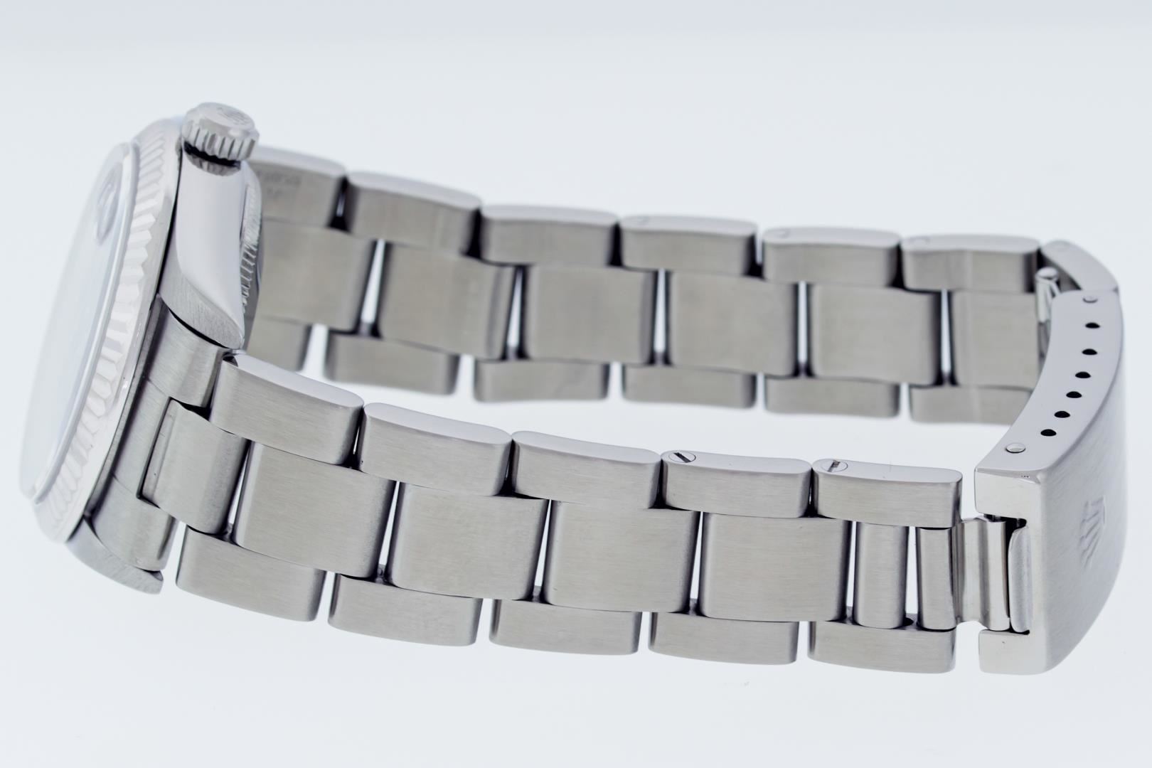 One Women's Pre Owned Midsize 31MM Stainless Steel Rolex Datejust Polished, Serviced & Electronically Tested, Rolex Stainless Steel Case Case: 31mm, Rolex Stainless Steel Crown, Rolex Bezel: 18K White Gold Fluted Bezel, Crystal: Sapphire With Cyclops Lens. Hands: Lumi Hands. Rolex Movement: Automatic Winding Movement 2235. Rolex Dial: Blue With Roman Hour Markers. Date Window: 3 O'Clock Position Date Display, Quickset, Model: Midsize Datejust. Condition: G-6 Extra Fine. Rolex Bracelet: Stainless Steel Oyster Band. Bright Polish. 6.0 Inch Length, Adjustable. Standard Clasp, With Rolex Logo. This Watch Has Been Serviced Time Tested And Is In Excellent Condition It Is Free Of All Scratches And Dents.