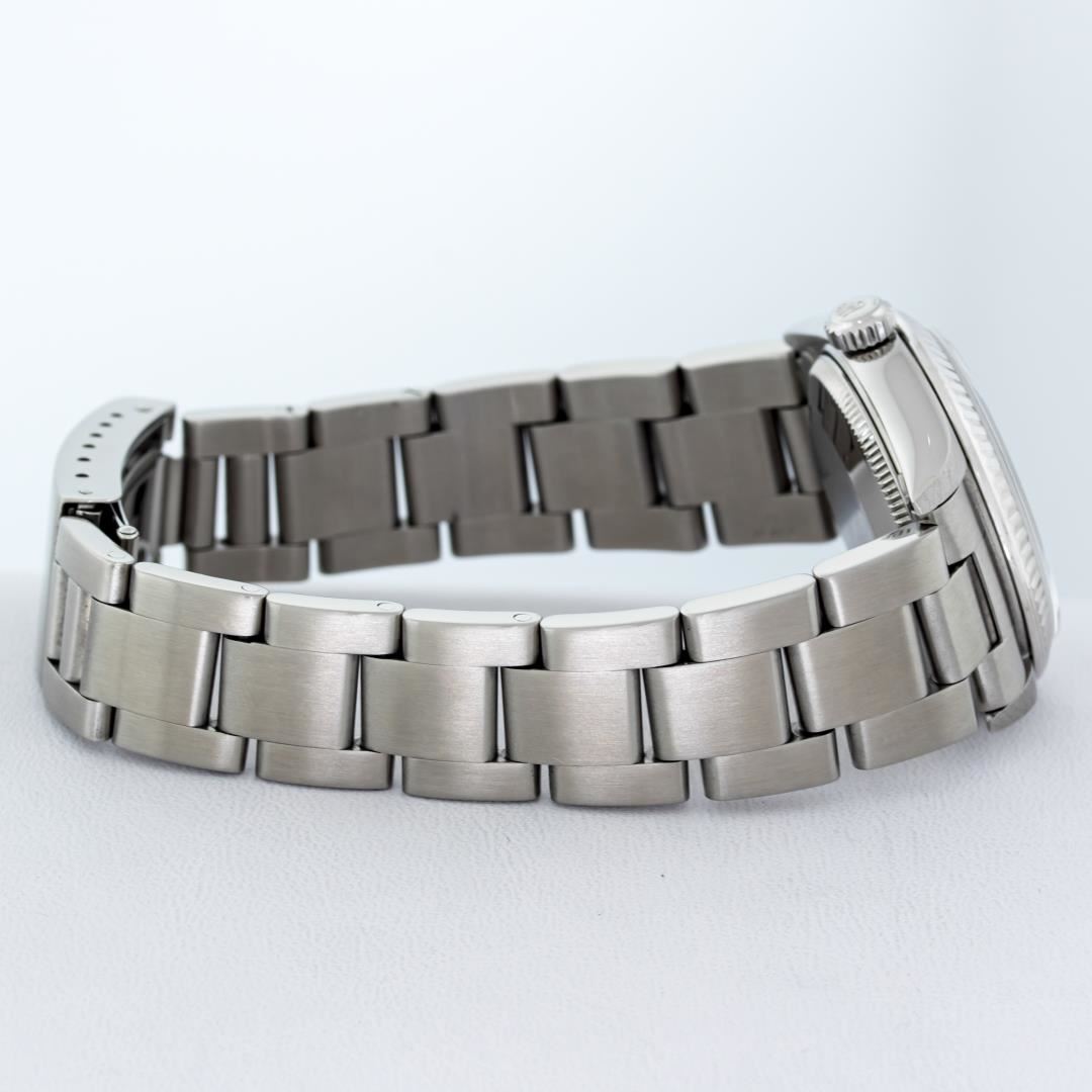 One Women's Rolex Midsize Stainless Steel Datejust Polished, Serviced & Electronically Tested, Rolex Stainless Steel Case : 31mm, Rolex Stainless Steel Crown, Rolex Bezel: 18K White Gold Fluted Bezel, Crystal: Sapphire With Cyclops Lens. Hands: Lumi Hands. Rolex Movement: Automatic Winding Movement 2235. Rolex Dial: Factory Blue Dial With Roman Hour Markers And Square Track. Date Window: 3 O'Clock Position Date Display, Quickset, Model: Midsize Quickset Datejust. Condition: G-6 Extra Fine. Rolex Bracelet: Stainless Steel Oyster Band. Bright Polish. 6.0 Inch Length, Adjustable. Standard Clasp, With Rolex Logo. This Pre Owned Watch Has Been Serviced Time Tested And Is In Excellent Condition It Is Free Of All Scratches And Dents.