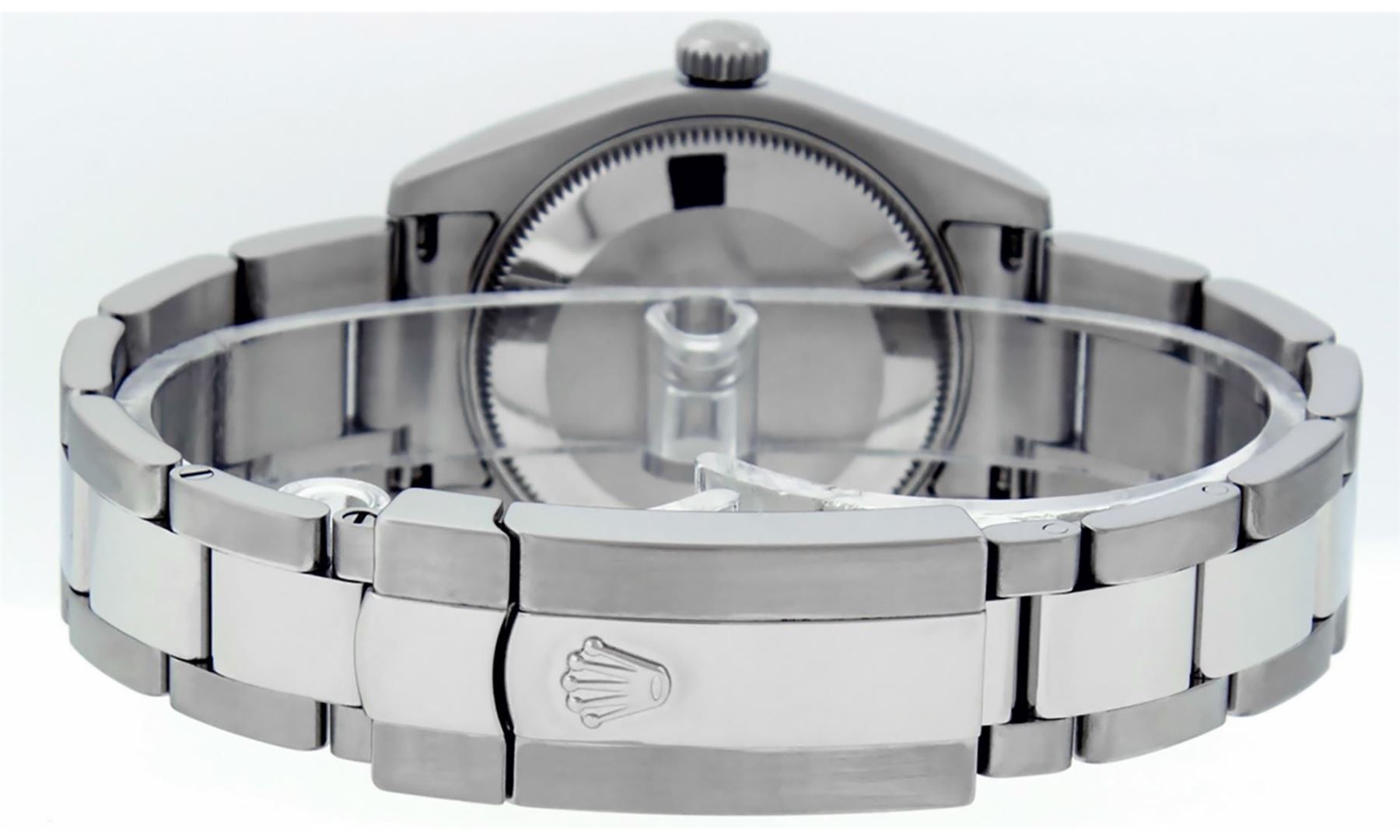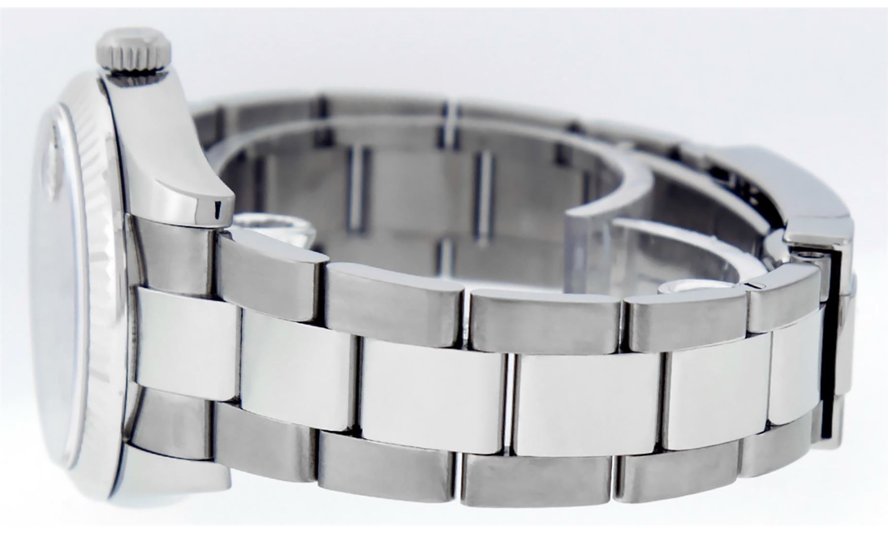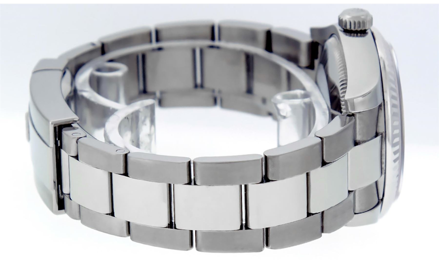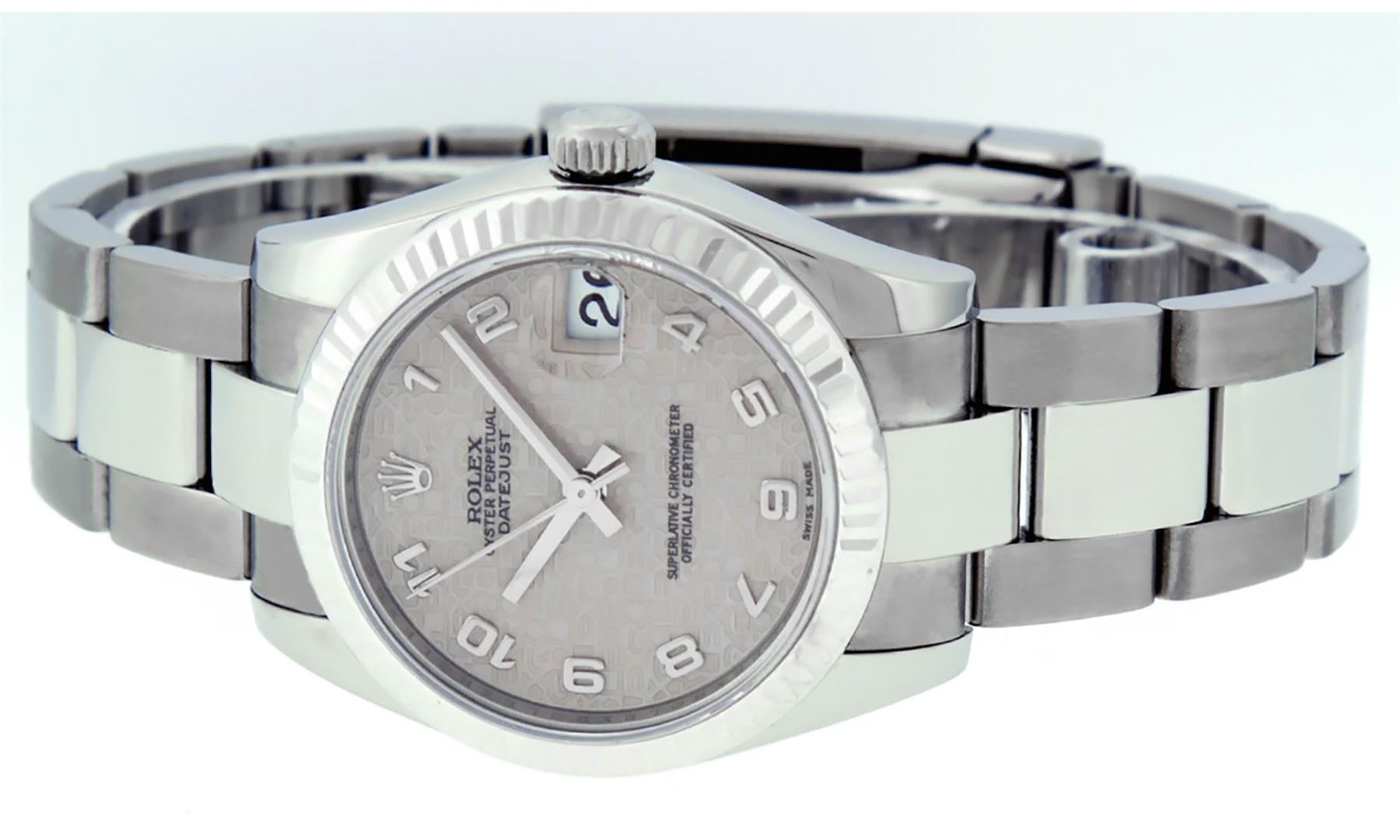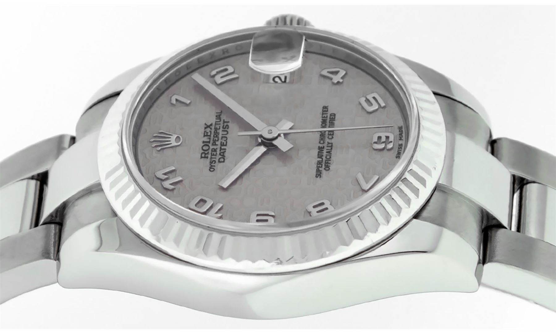 One Women's Midsize Stainless Steel Rolex Datejust Polished, Serviced & Electronically Tested, Rolex Stainless Steel Case : 31mm, Rolex Stainless Steel Crown, Rolex Bezel: 18K White Gold Fluted Bezel, Crystal: Sapphire With Cyclops Lens. Hands: White Hands. Rolex Movement: Automatic Winding Movement Caliber 2235. Rolex Dial: Cream Jubilee Dial With Arabic Hour Markers, Date Window: 3 O'Clock Position Date Display, Quickset, Model: Midsize Datejust. Condition: G-6 Extra Fine. Rolex Bracelet: Stainless Steel Oyster Band. Bright Polish. 6.0 Inch Length, Adjustable. Standard Clasp, With Rolex Logo. This Pre Owned Watch Has Been Serviced Time Tested And Is In Excellent Condition It Is Free Of All Scratches And Dents.