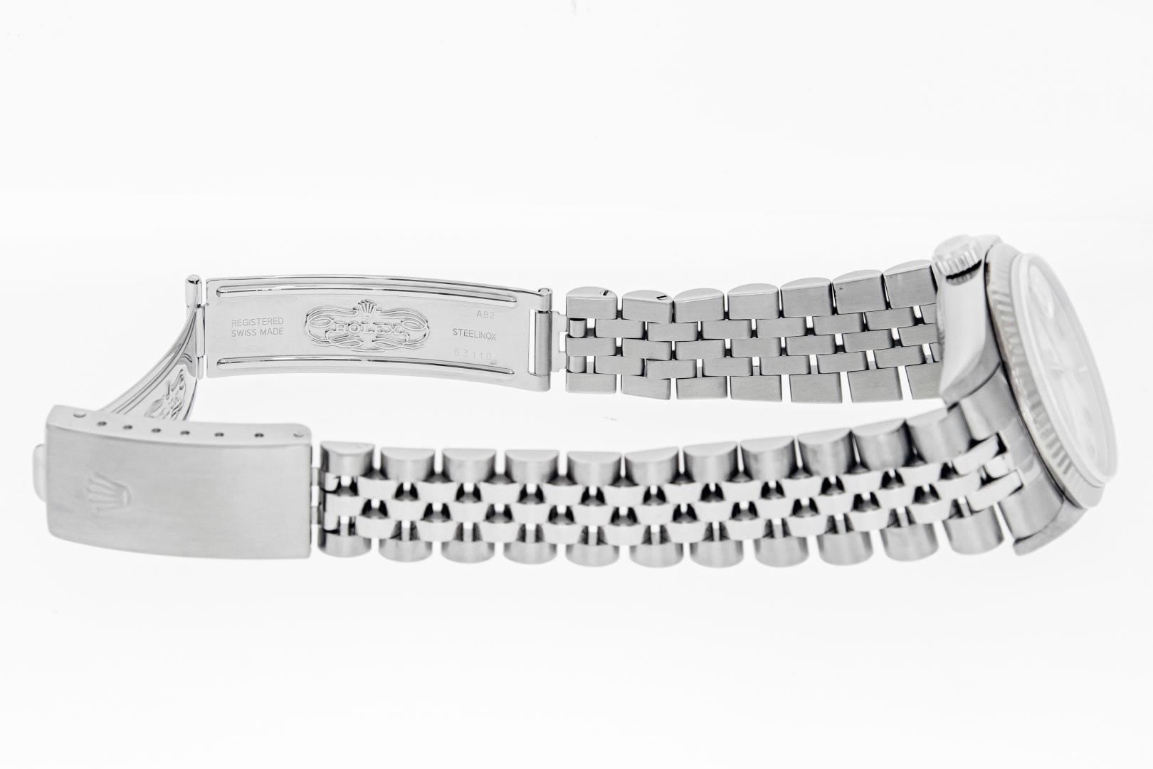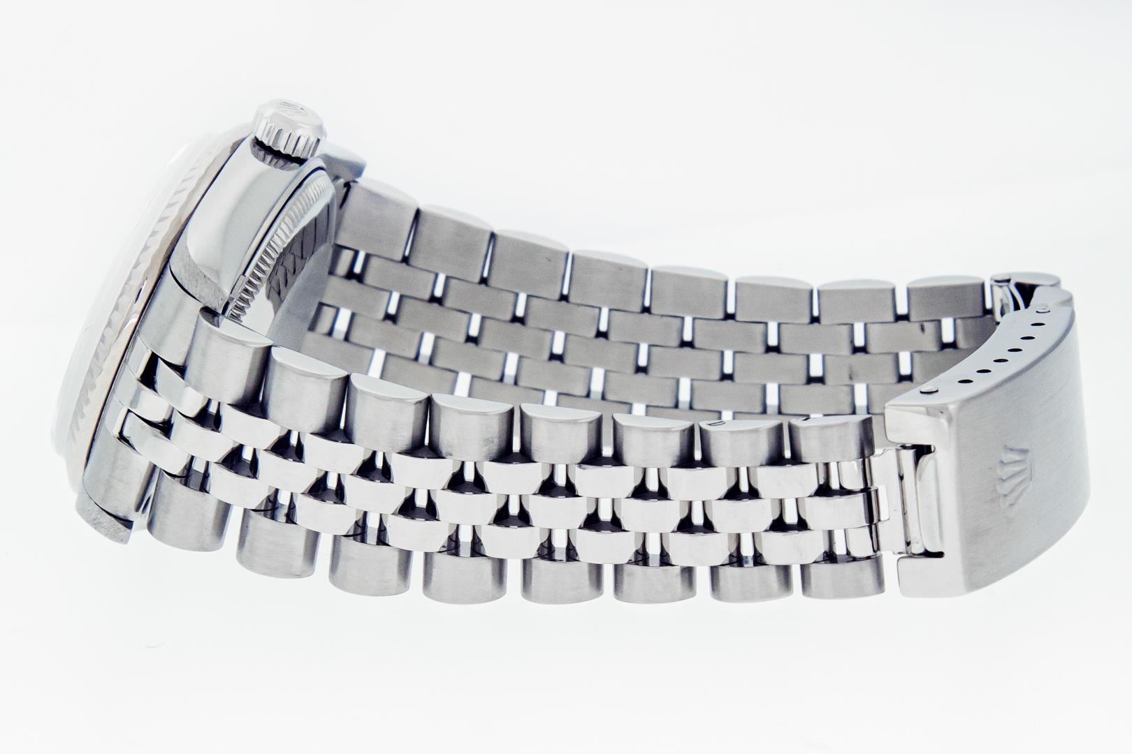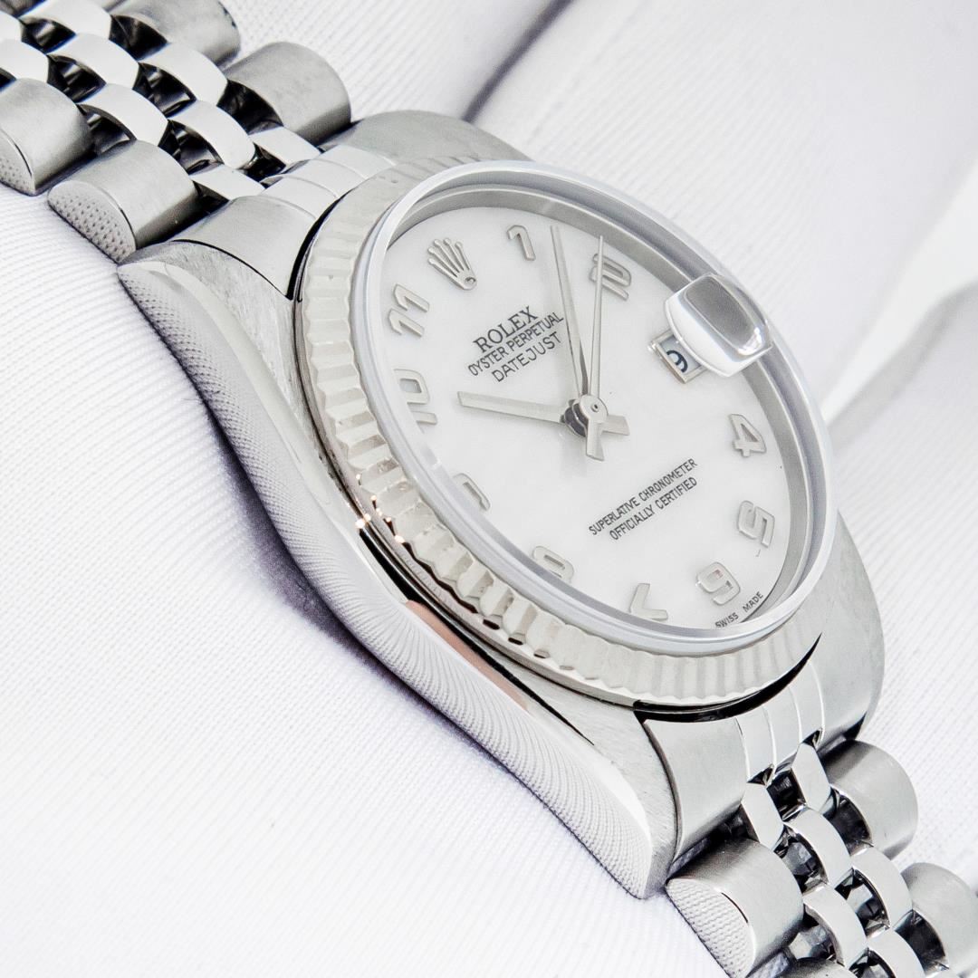 One Women's Pre Owned Midsize 31MM Stainless Steel Rolex Datejust Polished, Serviced & Electronically Tested, Rolex Stainless Steel Case Case: 31mm, Rolex Stainless Steel Crown, Rolex Bezel: 18K White Gold Fluted Bezel, Crystal: Sapphire With Cyclops Lens. Hands: Solid Hands. Rolex Movement: Automatic Winding Movement 2235. Rolex Dial: Mother Of Pearl With Arabic Hour Markers. Date Window: 3 O'Clock Position Date Display, Quickset, Model: Midsize Datejust. Condition: G-6 Extra Fine. Rolex Bracelet: Stainless Steel Jubilee Band. Bright Polish. 6.0 Inch Length, Adjustable. Standard Clasp, With Rolex Logo. This Watch Has Been Serviced Time Tested And Is In Excellent Condition It Is Free Of All Scratches And Dents.