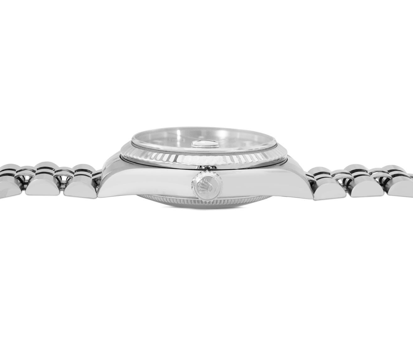One Rolex Ladies Midsize Pre Owned Stainless Steel Datejust Wristwatch Polished with Satin Finish, Serviced And Electronically Tested, Stainless Steel Case: 31mm, Stainless Steel Crown, Bezel: 18K White Gold Fluted Bezel. Crystal: Sapphire With Magnifying Date Window. Hands: Solid Hands. Rolex Movement: Automatic Winding Movement 2235. Rolex Factory Dial: Salmon Dial With Arabic Hour Markers. Date Window: 3 O'Clock Position Date Display, Model: Quickset Datejust. Condition: G-6 Extra Fine. Rolex Bracelet: Stainless Steel Jubilee Band. Bright Polish And Satin Finish. 6.0 Inch Length, Adjustable. Standard Clasp, With Rolex Logo. This Watch Has Been Serviced Time Tested And Is In Excellent Condition It Is Free Of All Scratches And Dents. This Watch Comes With A Rolex Box.