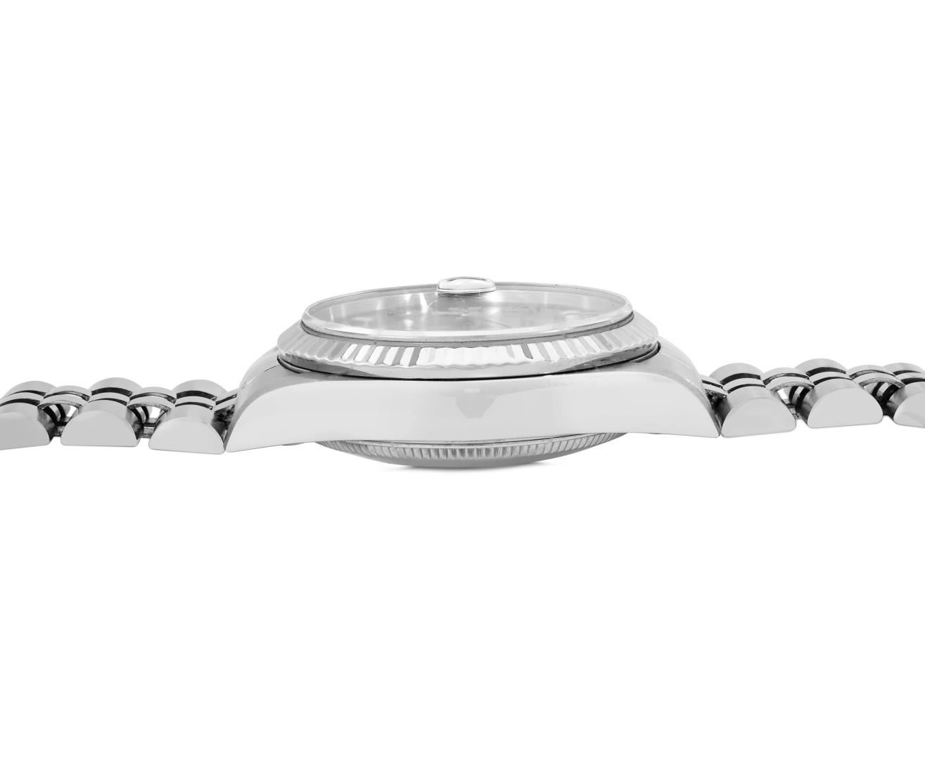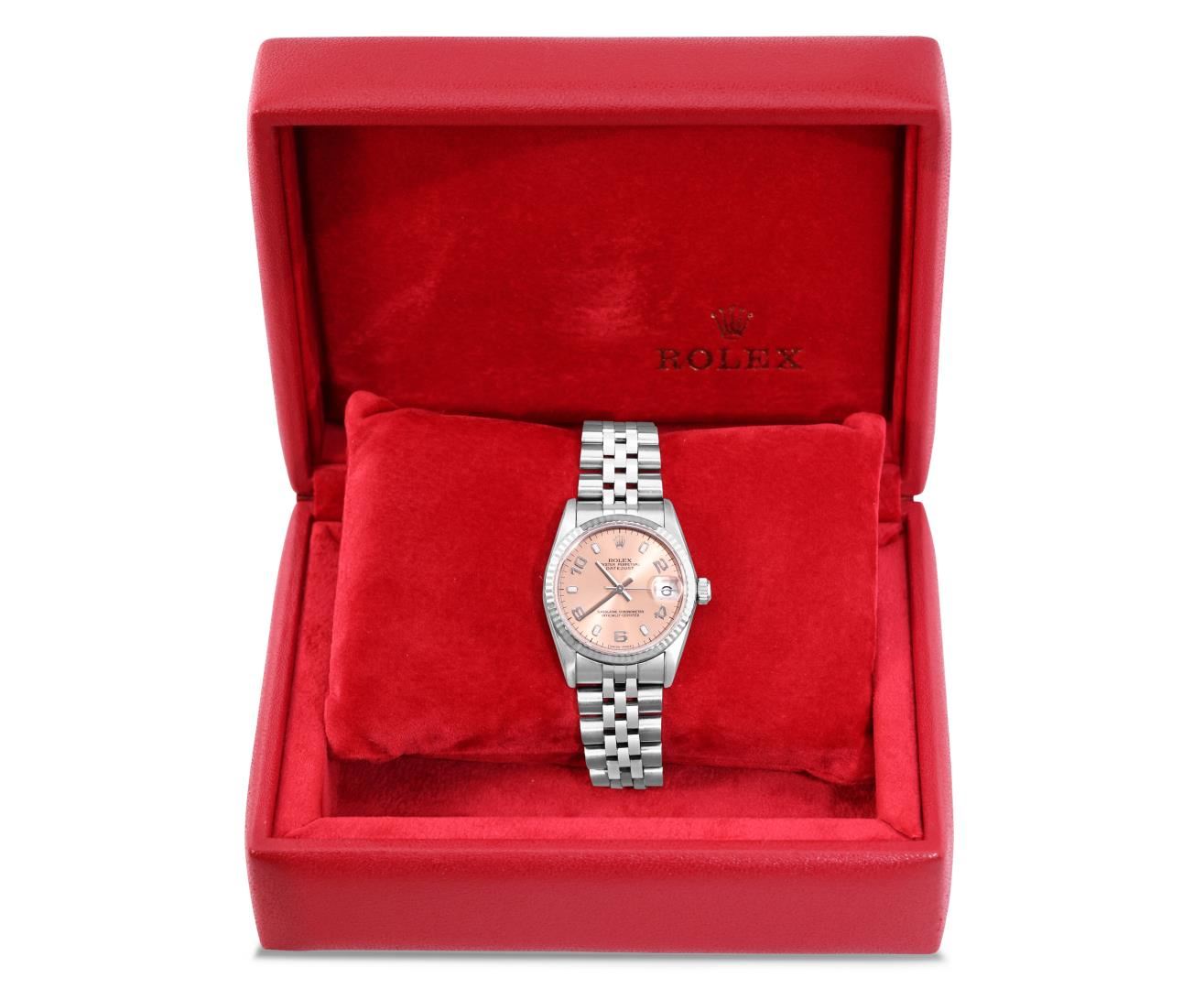 One Rolex Ladies Midsize Pre Owned Stainless Steel Datejust Wristwatch Polished with Satin Finish, Serviced And Electronically Tested, Stainless Steel Case: 31mm, Stainless Steel Crown, Bezel: 18K White Gold Fluted Bezel. Crystal: Sapphire With Magnifying Date Window. Hands: Solid Hands. Rolex Movement: Automatic Winding Movement 2235. Rolex Factory Dial: Salmon Dial With Arabic Hour Markers. Date Window: 3 O'Clock Position Date Display, Model: Quickset Datejust. Condition: G-6 Extra Fine. Rolex Bracelet: Stainless Steel Jubilee Band. Bright Polish And Satin Finish. 6.0 Inch Length, Adjustable. Standard Clasp, With Rolex Logo. This Watch Has Been Serviced Time Tested And Is In Excellent Condition It Is Free Of All Scratches And Dents. This Watch Comes With A Rolex Box.