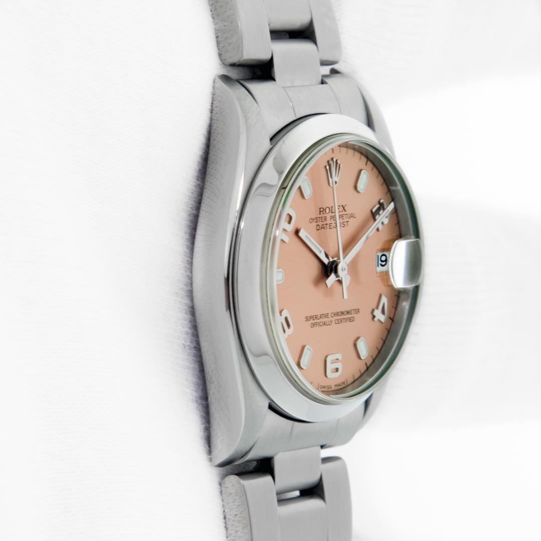 One Women's Pre Owned 31MM Midsize Stainless Steel Rolex Datejust Polished, Serviced & Electronically Tested, Rolex Stainless Steel Case Case: 31mm, Rolex Stainless Steel Crown, Rolex Bezel: Stainless Steel Smooth Bezel, Crystal: Sapphire With Magnified Date Window. Hands: Lumi Hands. Rolex Movement: Automatic Winding Movement 2235. Rolex Dial: Factory Salmon Arabic Dial With Index Hour Markers. Date Window: 3 O'Clock Position Date Display, Quickset, Model: Midsize Datejust. Condition: G-6 Extra Fine. Rolex Bracelet: Stainless Steel Oyster Band. Bright Polish. 6.0 Inch Length, Adjustable. Standard Clasp, With Rolex Logo. This Watch Has Been Serviced Time Tested And Is In Excellent Condition It Is Free Of All Scratches And Dents.