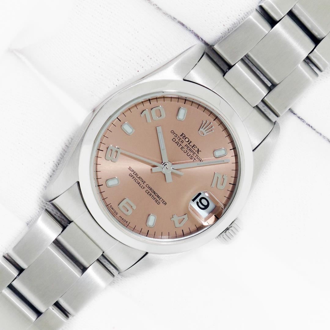 One Women's Pre Owned 31MM Midsize Stainless Steel Rolex Datejust Polished, Serviced & Electronically Tested, Rolex Stainless Steel Case Case: 31mm, Rolex Stainless Steel Crown, Rolex Bezel: Stainless Steel Smooth Bezel, Crystal: Sapphire With Magnified Date Window. Hands: Lumi Hands. Rolex Movement: Automatic Winding Movement 2235. Rolex Dial: Factory Salmon Arabic Dial With Index Hour Markers. Date Window: 3 O'Clock Position Date Display, Quickset, Model: Midsize Datejust. Condition: G-6 Extra Fine. Rolex Bracelet: Stainless Steel Oyster Band. Bright Polish. 6.0 Inch Length, Adjustable. Standard Clasp, With Rolex Logo. This Watch Has Been Serviced Time Tested And Is In Excellent Condition It Is Free Of All Scratches And Dents.