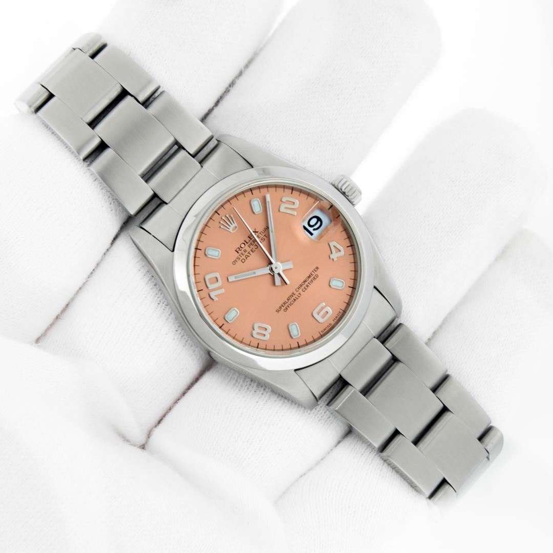 One Women's Pre Owned 31MM Midsize Stainless Steel Rolex Datejust Polished, Serviced & Electronically Tested, Rolex Stainless Steel Case Case: 31mm, Rolex Stainless Steel Crown, Rolex Bezel: Stainless Steel Smooth Bezel, Crystal: Sapphire With Magnified Date Window. Hands: Lumi Hands. Rolex Movement: Automatic Winding Movement 2235. Rolex Dial: Factory Salmon Arabic Dial With Index Hour Markers. Date Window: 3 O'Clock Position Date Display, Quickset, Model: Midsize Datejust. Condition: G-6 Extra Fine. Rolex Bracelet: Stainless Steel Oyster Band. Bright Polish. 6.0 Inch Length, Adjustable. Standard Clasp, With Rolex Logo. This Watch Has Been Serviced Time Tested And Is In Excellent Condition It Is Free Of All Scratches And Dents.