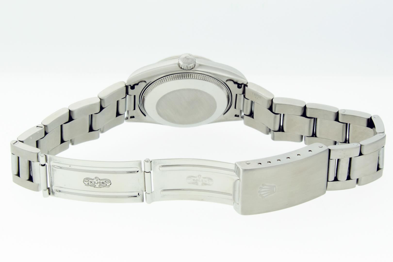 One Women's Rolex Midsize Stainless Steel Datejust Polished, Serviced & Electronically Tested, Rolex Stainless Steel Case : 31mm, Rolex Stainless Steel Crown, Rolex Bezel: Stainless Steel Smooth Bezel, Crystal: Sapphire With Cyclops Lens. Hands: Lumi Hands. Rolex Movement: Automatic Winding Movement 2235. Rolex Dial: Factory Salmon Arabic Dial With Index Hour Markers And Dash Track. Date Window: 3 O'Clock Position Date Display, Quickset, Model: Midsize Quickset Datejust. Condition: G-6 Extra Fine. Rolex Bracelet: Stainless Steel Oyster Band. Bright Polish. 6.0 Inch Length, Adjustable. Standard Clasp, With Rolex Logo. This Pre Owned Watch Has Been Serviced Time Tested And Is In Excellent Condition It Is Free Of All Scratches And Dents.