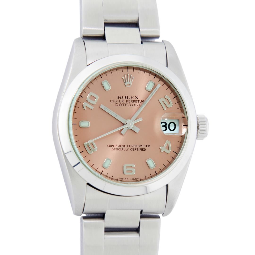 One Women's Rolex Midsize Stainless Steel Datejust Polished, Serviced & Electronically Tested, Rolex Stainless Steel Case : 31mm, Rolex Stainless Steel Crown, Rolex Bezel: Stainless Steel Smooth Bezel, Crystal: Sapphire With Cyclops Lens. Hands: Lumi Hands. Rolex Movement: Automatic Winding Movement 2235. Rolex Dial: Factory Salmon Arabic Dial With Index Hour Markers And Dash Track. Date Window: 3 O'Clock Position Date Display, Quickset, Model: Midsize Quickset Datejust. Condition: G-6 Extra Fine. Rolex Bracelet: Stainless Steel Oyster Band. Bright Polish. 6.0 Inch Length, Adjustable. Standard Clasp, With Rolex Logo. This Pre Owned Watch Has Been Serviced Time Tested And Is In Excellent Condition It Is Free Of All Scratches And Dents.