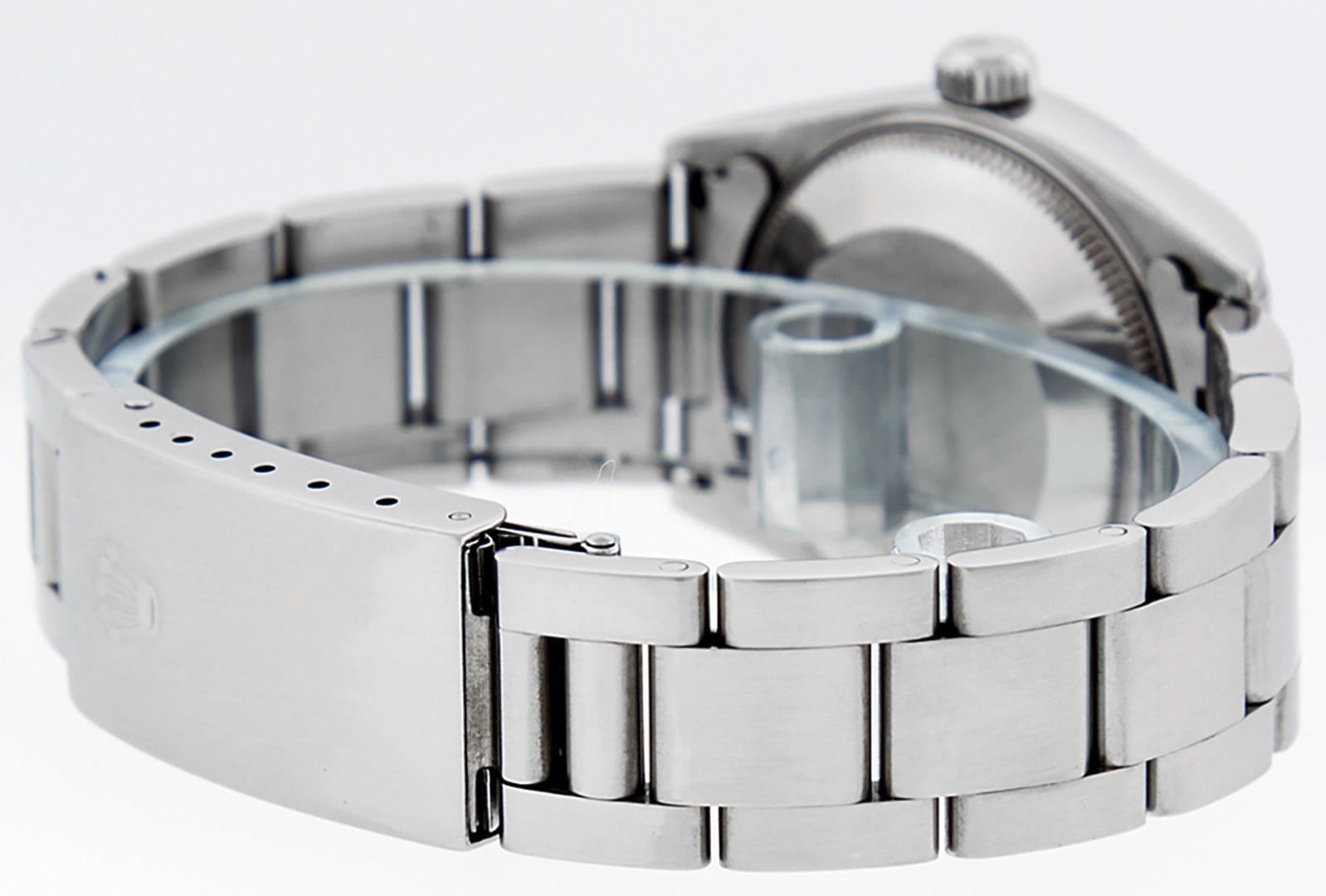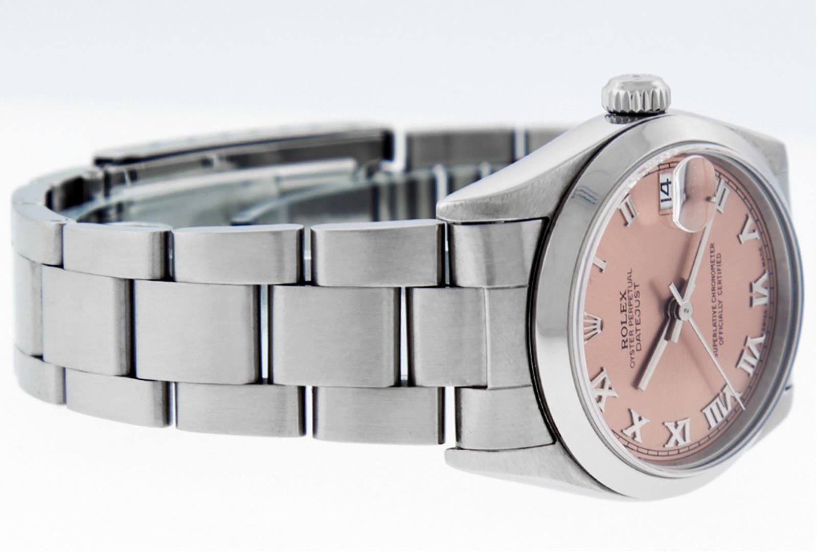 One Women's Midsize Rolex Stainless Steel Datejust Polished, Serviced & Electronically Tested, Rolex Stainless Steel Case : 31mm, Rolex Stainless Steel Crown, Rolex Bezel: Stainless Steel Smooth Bezel, Crystal: Sapphire With Magnified Date Window. Hands: Solid Hands. Rolex Movement: Automatic Winding Movement Caliber 2135. Rolex Dial: Salmon Roman Dial With Square Track. Date Window: 3 O'Clock Position Date Display, Quickset, Model: Quickset Midsize Datejust. Condition: G-6 Extra Fine. Rolex Bracelet: Stainless Steel Oyster Band. Bright Polish. 6.0 Inch Length, Adjustable. Standard Clasp, With Rolex Logo. This Pre Owned Watch Has Been Serviced Time Tested And Is In Excellent Condition It Is Free Of All Scratches And Dents.