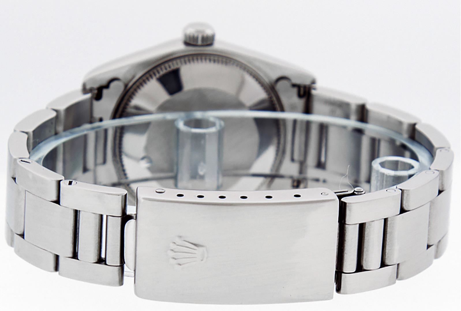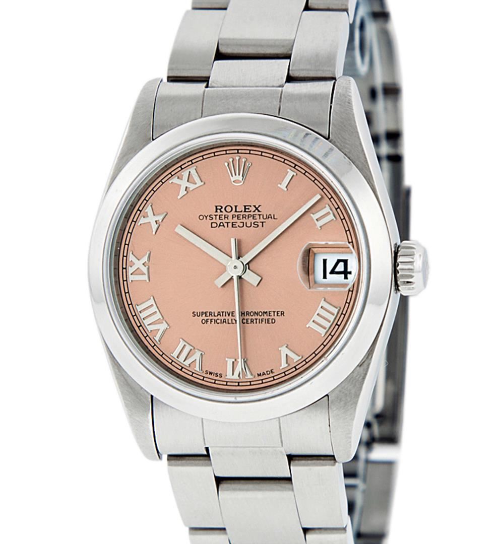One Women's Midsize Rolex Stainless Steel Datejust Polished, Serviced & Electronically Tested, Rolex Stainless Steel Case : 31mm, Rolex Stainless Steel Crown, Rolex Bezel: Stainless Steel Smooth Bezel, Crystal: Sapphire With Magnified Date Window. Hands: Solid Hands. Rolex Movement: Automatic Winding Movement Caliber 2135. Rolex Dial: Salmon Roman Dial With Square Track. Date Window: 3 O'Clock Position Date Display, Quickset, Model: Quickset Midsize Datejust. Condition: G-6 Extra Fine. Rolex Bracelet: Stainless Steel Oyster Band. Bright Polish. 6.0 Inch Length, Adjustable. Standard Clasp, With Rolex Logo. This Pre Owned Watch Has Been Serviced Time Tested And Is In Excellent Condition It Is Free Of All Scratches And Dents.