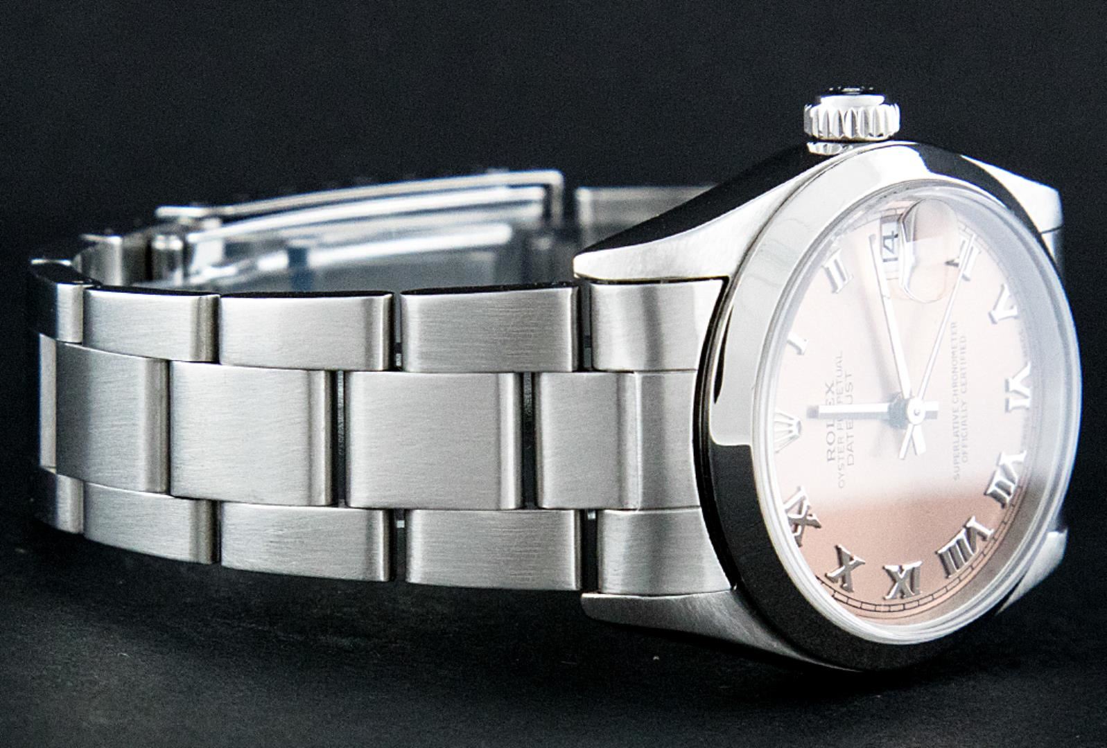 One Women's Midsize Rolex Stainless Steel Datejust Polished, Serviced & Electronically Tested, Rolex Stainless Steel Case : 31mm, Rolex Stainless Steel Crown, Rolex Bezel: Stainless Steel Smooth Bezel, Crystal: Sapphire With Magnified Date Window. Hands: Solid Hands. Rolex Movement: Automatic Winding Movement Caliber 2135. Rolex Dial: Salmon Roman Dial With Square Track. Date Window: 3 O'Clock Position Date Display, Quickset, Model: Quickset Midsize Datejust. Condition: G-6 Extra Fine. Rolex Bracelet: Stainless Steel Oyster Band. Bright Polish. 6.0 Inch Length, Adjustable. Standard Clasp, With Rolex Logo. This Pre Owned Watch Has Been Serviced Time Tested And Is In Excellent Condition It Is Free Of All Scratches And Dents.