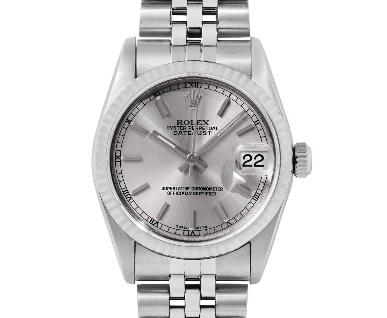 One Rolex Ladies Sapphire Pre Owned Stainless Steel Datejust Wristwatch Polished with Satin Finish, Serviced & Electronically Tested, Stainless Steel Case: 31mm, Stainless Steel Crown, Bezel: 18K White Gold Fluted Bezel. Crystal: Sapphire With Magnifying Date Window. Hands: Luminescent Hands. Rolex Movement: Automatic Winding Movement 2235. Rolex Factory Dial: Silver With Index Hour Markers. Date Window: 3 O'clock Position Date Display, Model: Quickset Datejust. Condition: G-6 Extra Fine. Rolex Bracelet: Stainless Steel Jubilee Band. Bright Polish And Satin Finish. 6.0 Inch Length, Adjustable. Standard Clasp, With Rolex Logo. This Watch Has Been Serviced Time Tested And Is In Excellent Condition It Is Free Of All Scratches And Dents.