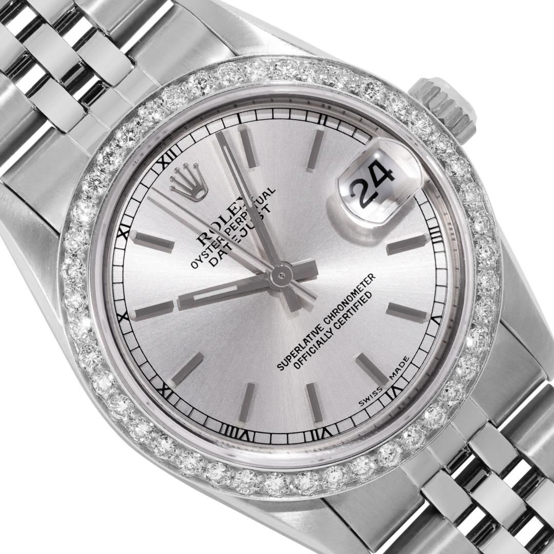 One Rolex Ladies Pre Owned Stainless Steel 31MM Datejust Wristwatch Polished Bright with Satin Finish, Serviced & Electronically Tested, Stainless Steel Case: 31mm, Stainless Steel Crown, Custom Bezel: New 18K White Gold Beadset Diamond Bezel, Diamond + Gem Count: 40 Diamonds. Custom Crystal: New Sapphire With Magnifying Date Window. Custom Hands: New Luminescent Hands. Rolex Movement: Automatic Winding Movement 2235. Rolex Dial: Factory Silver With Index Hour Markers, Lumi Dots, and Roman Track. Date Window: 3 O'Clock Position Date Display, Model: Quickset Sapphire Datejust. Condition: G-6 Extra Fine. Rolex Bracelet: Stainless Steel Jubilee Band. Bright Polish & Satin Finish. 6.0 Inch Length, Adjustable. Standard Clasp, With Rolex Logo. This Watch Has Been Serviced Time Tested And Is In Excellent Condition It Is Free Of All Scratches And Dents.