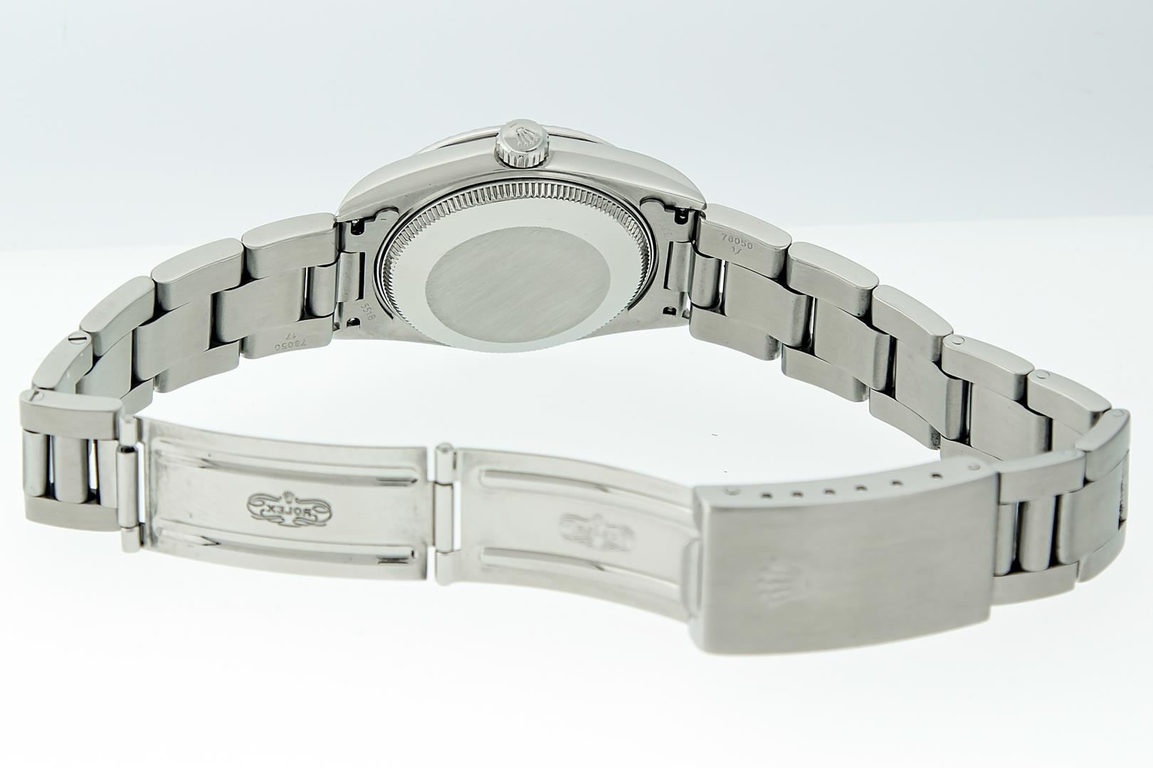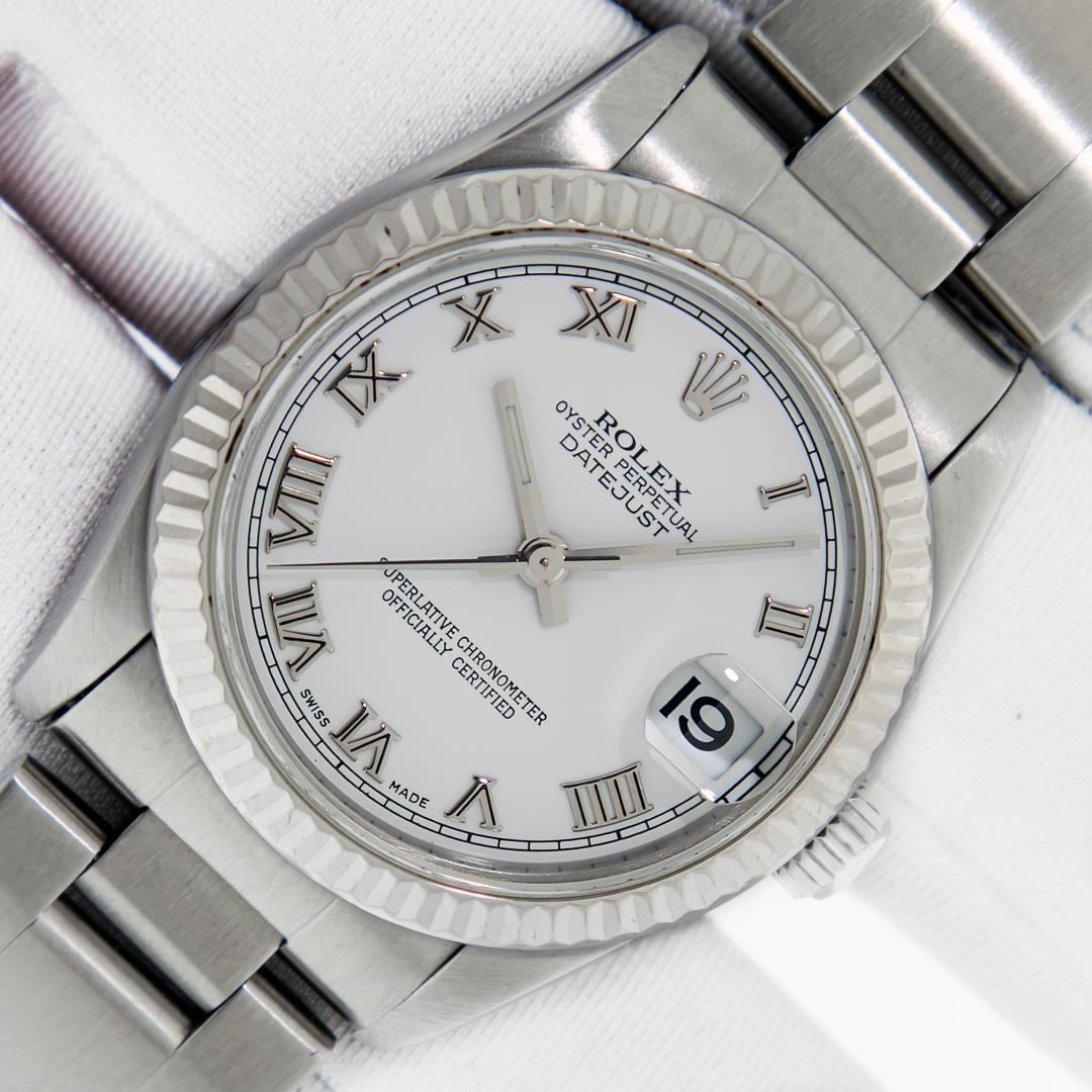 One Women's Pre Owned Midsize 31MM Stainless Steel Rolex Datejust Polished, Serviced & Electronically Tested, Rolex Stainless Steel Case Case: 31mm, Rolex Stainless Steel Crown, Rolex Bezel: 18K White Gold Fluted Bezel, Crystal: Sapphire With Cyclops Lens. Hands: Lumi Hands. Rolex Movement: Automatic Winding Movement 2235. Rolex Dial: White Roman With Index Hour Markers. Date Window: 3 O'Clock Position Date Display, Quickset, Model: Midsize Datejust. Condition: G-6 Extra Fine. Rolex Bracelet: Stainless Steel Oyster Band. Bright Polish. 6.0 Inch Length, Adjustable. Standard Clasp, With Rolex Logo. This Watch Has Been Serviced Time Tested And Is In Excellent Condition It Is Free Of All Scratches And Dents. This Watch Comes With A Rolex Box, Wallet, & Booklet.