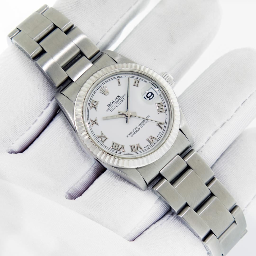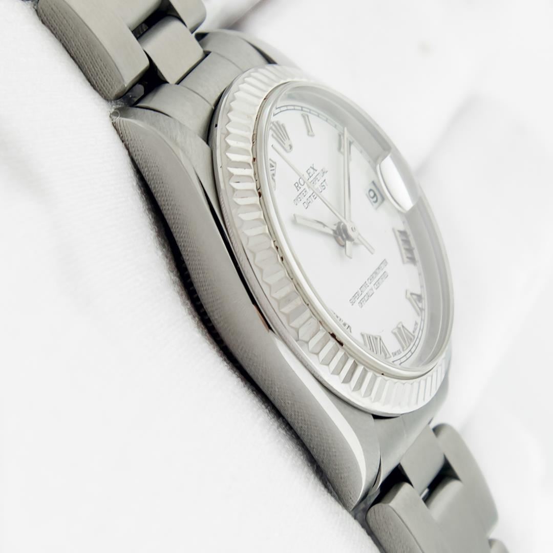 One Women's Pre Owned Midsize 31MM Stainless Steel Rolex Datejust Polished, Serviced & Electronically Tested, Rolex Stainless Steel Case Case: 31mm, Rolex Stainless Steel Crown, Rolex Bezel: 18K White Gold Fluted Bezel, Crystal: Sapphire With Cyclops Lens. Hands: Lumi Hands. Rolex Movement: Automatic Winding Movement 2235. Rolex Dial: White Roman With Index Hour Markers. Date Window: 3 O'Clock Position Date Display, Quickset, Model: Midsize Datejust. Condition: G-6 Extra Fine. Rolex Bracelet: Stainless Steel Oyster Band. Bright Polish. 6.0 Inch Length, Adjustable. Standard Clasp, With Rolex Logo. This Watch Has Been Serviced Time Tested And Is In Excellent Condition It Is Free Of All Scratches And Dents. This Watch Comes With A Rolex Box, Wallet, & Booklet.