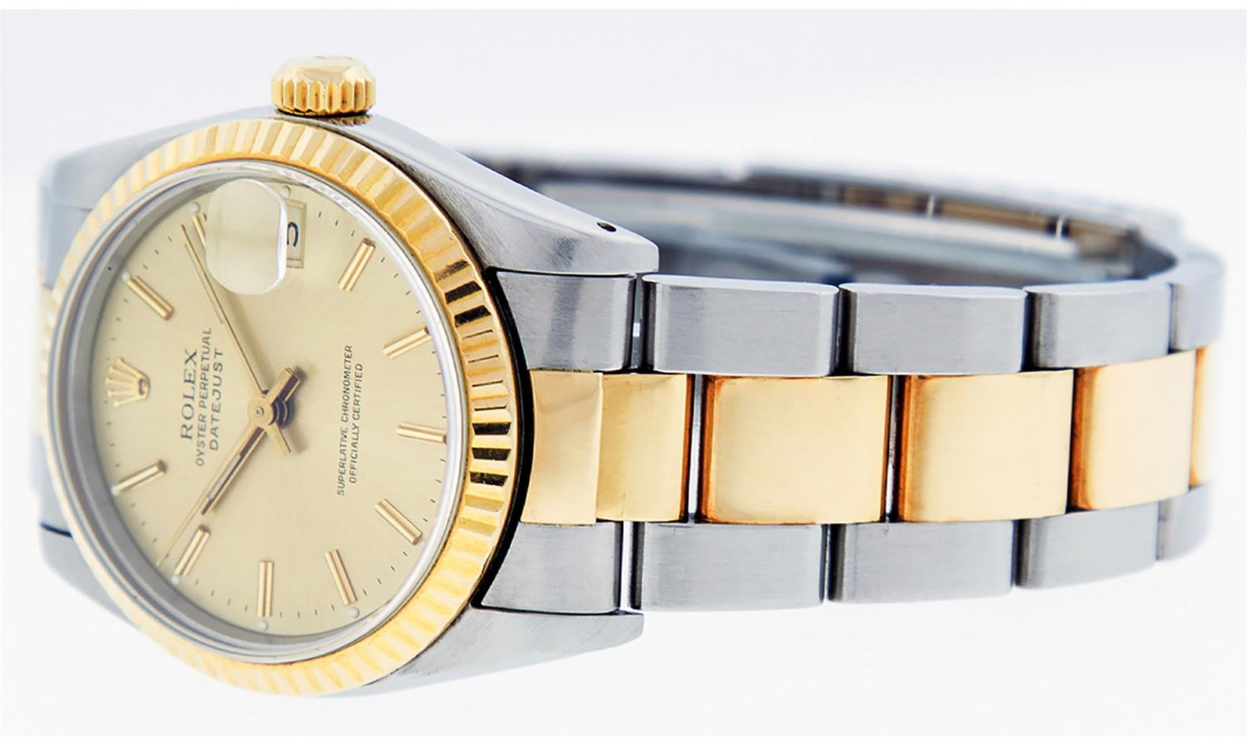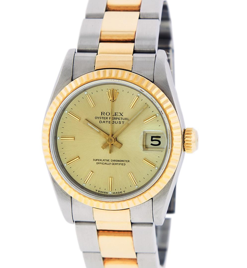 One Women's Midsize 18K Yellow Gold And Stainless Steel Rolex Datejust Polished, Serviced & Electronically Tested, Rolex Stainless Steel Case 31mm, Rolex Yellow Gold Crown, Rolex Bezel: 18K Yellow Gold Fluted Bezel. Crystal: Sapphire With Magnified Date Window. Hands: Luminescent Hands. Rolex Movement: Automatic Winding Movement Caliber 2135. Rolex Dial: Champagne Index Dial With Dash Track And Lumi Dots, Date Window: 3 O'Clock Position Date Display, Quickset, Model: Midsize Quickset Datejust. Condition: G-6 Extra Fine. Rolex Bracelet: 18K Yellow Gold And Stainless Steel Oyster Band. Bright Polish. 6.0 Inch Length, Adjustable. Standard Clasp, With Rolex Logo. This Pre Owned Watch Has Been Serviced Time Tested And Is In Excellent Condition It Is Free Of All Scratches And Dents.