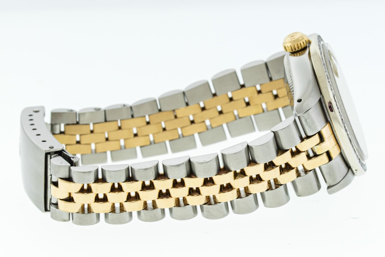 One Women's Pre Owned Midsize Stainless Steel and 18K Yellow Gold Rolex Datejust Polished, Serviced & Electronically Tested, Rolex Stainless Steel And Yellow Gold Case: 31mm, Rolex Yellow Gold Crown, Custom Bezel: White Gold Channel Set Diamond Bezel , Color: G To H, Clarity: VS2-SI1. Custom Crystal: New Sapphire With Magnified Date Window. Hands: Luminescent Hands. Rolex Movement: Automatic Winding Movement Caliber 2135. Rolex Dial: Champagne Index Dial With Lumi Dots, Date Window: 3 O'Clock Position Date Display, Quickset, Model: Midsize Datejust. Condition: G-6 Extra Fine. Rolex Bracelet: Stainless Steel and Yellow Gold Jubilee Band. Bright Polish. 6.0 Inch Length, Adjustable. Standard Clasp, With Rolex Logo. This Pre Owned Watch Has Been Serviced Time Tested And Is In Excellent Condition It Is Free Of All Scratches And Dents. This Watch Comes With A Rolex Box, Wallet, & Booklet.