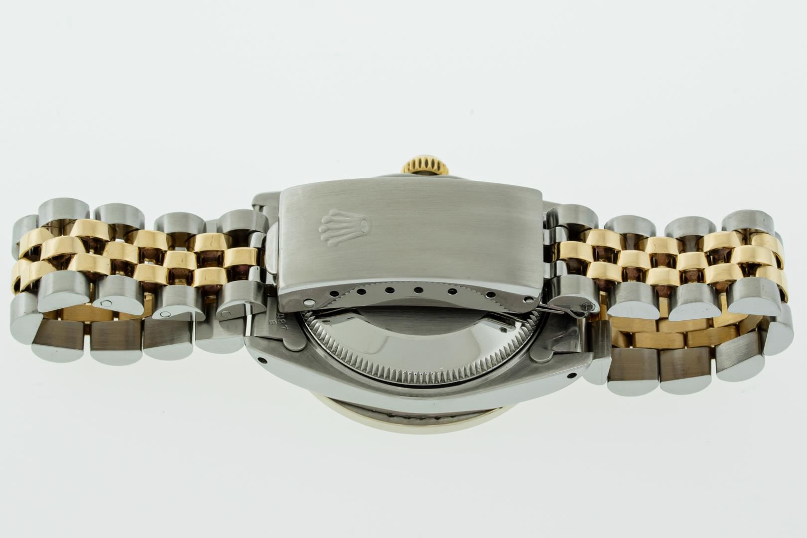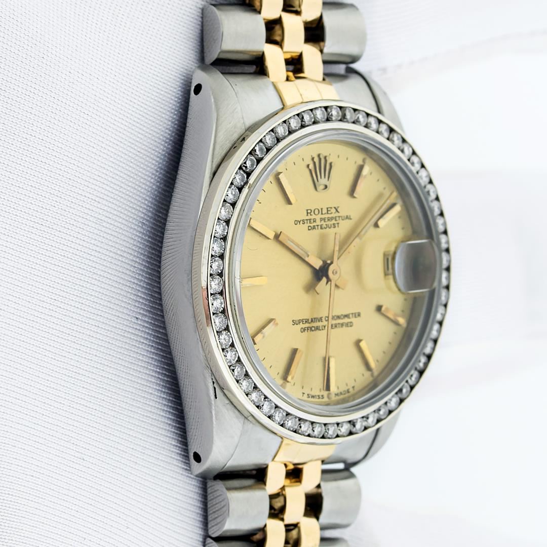 One Women's Pre Owned Midsize Stainless Steel and 18K Yellow Gold Rolex Datejust Polished, Serviced & Electronically Tested, Rolex Stainless Steel And Yellow Gold Case: 31mm, Rolex Yellow Gold Crown, Custom Bezel: White Gold Channel Set Diamond Bezel , Color: G To H, Clarity: VS2-SI1. Custom Crystal: New Sapphire With Magnified Date Window. Hands: Luminescent Hands. Rolex Movement: Automatic Winding Movement Caliber 2135. Rolex Dial: Champagne Index Dial With Lumi Dots, Date Window: 3 O'Clock Position Date Display, Quickset, Model: Midsize Datejust. Condition: G-6 Extra Fine. Rolex Bracelet: Stainless Steel and Yellow Gold Jubilee Band. Bright Polish. 6.0 Inch Length, Adjustable. Standard Clasp, With Rolex Logo. This Pre Owned Watch Has Been Serviced Time Tested And Is In Excellent Condition It Is Free Of All Scratches And Dents. This Watch Comes With A Rolex Box, Wallet, & Booklet.