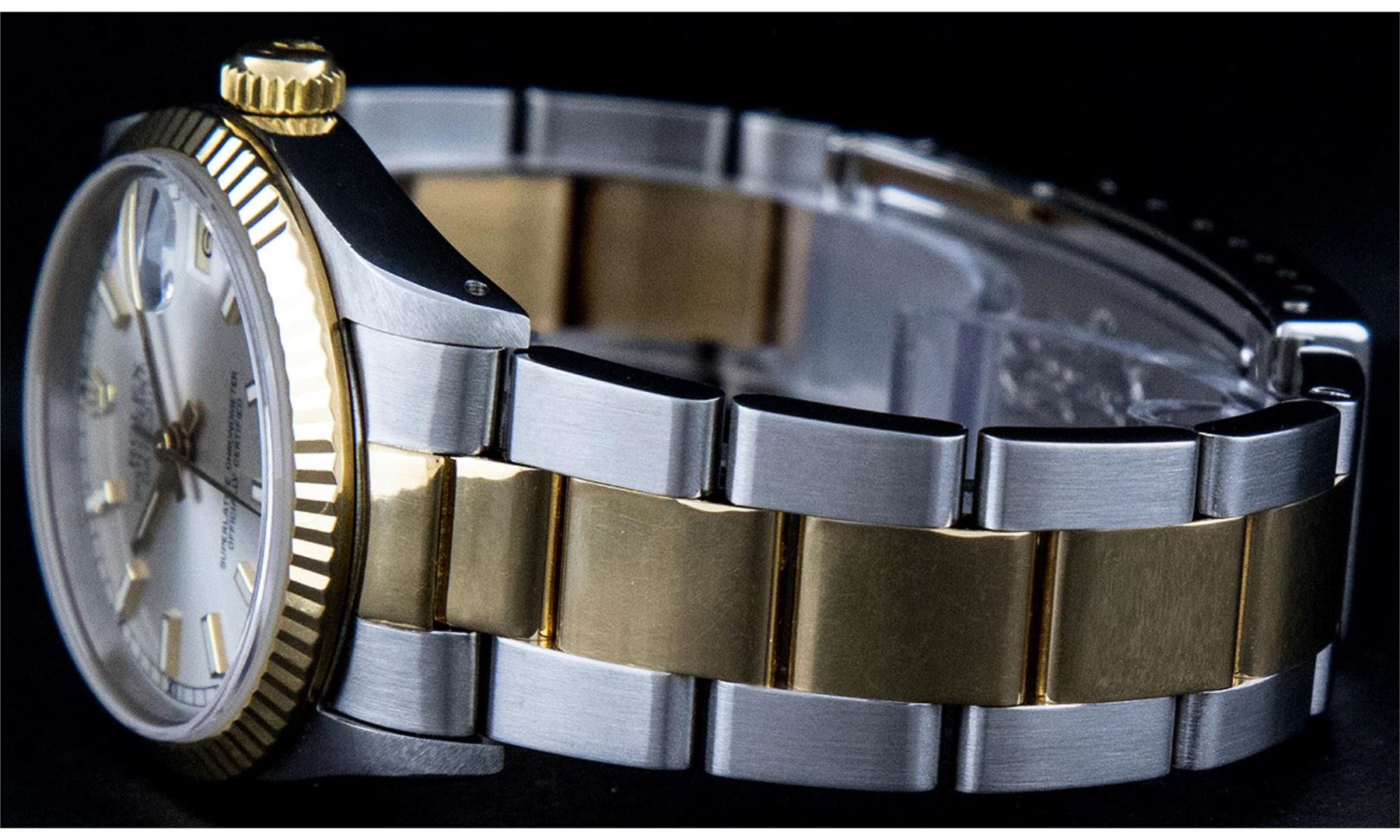 One Women's Rolex Midsize 18K Yellow Gold And Stainless Steel Datejust Polished, Serviced & Electronically Tested, Rolex Yellow Gold And Stainless Steel Case : 31mm, Rolex Stainless Steel Crown, Rolex Bezel: 18K Rolex Yellow Gold Fluted Bezel. Custom Crystal: New Sapphire With Magnified Date Window. Custom Hands: New Luminescent Hands. Rolex Movement: Automatic Winding Movement Caliber 2135. Rolex Dial: Silver Index Dial With Square Roman Track. Date Window: 3 O'Clock Position Date Display, Quickset, Model: Midsize Quickset Datejust. Condition: G-6 Extra Fine. Rolex Bracelet: 18K Yellow Gold And Stainless Steel Oyster Band. Bright Polish. 6.0 Inch Length, Adjustable. Standard Clasp, With Rolex Logo. This Pre Owned Watch Has Been Serviced Time Tested And Is In Excellent Condition It Is Free Of All Scratches And Dents.