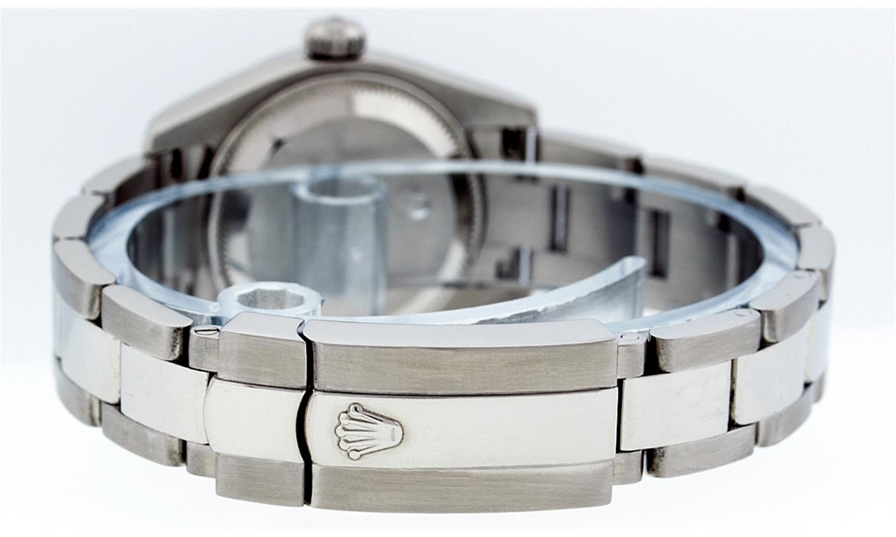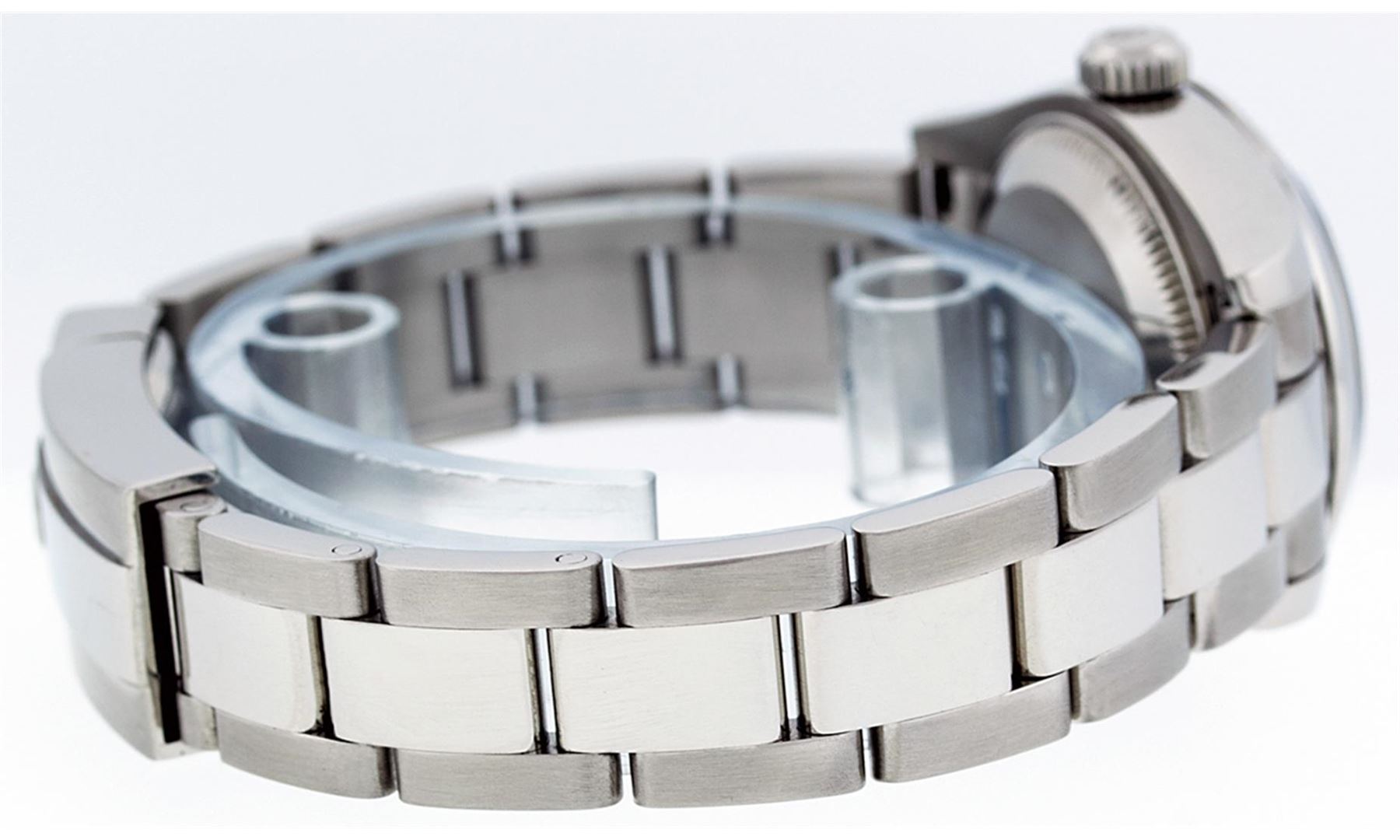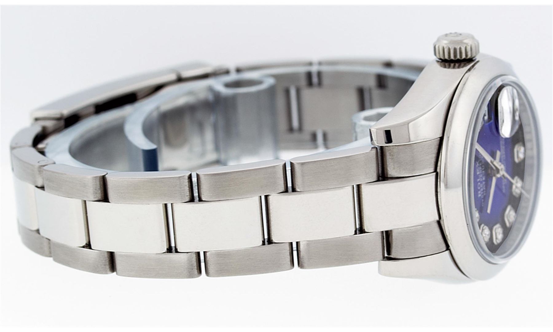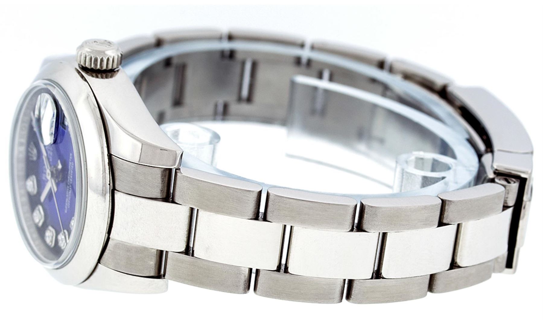 One New Style Ladies Pre Owned Quickset Stainless Steel Rolex Datejust Polished Bright with Satin Finish, Serviced & Electronically Tested, Rolex Stainless Steel Case: 26mm, Rolex Stainless Steel Crown, Rolex Bezel: Stainless Steel Smooth Bezel. Rolex Crystal: Scratch Resistant Sapphire Cyclops Lens. Rolex Hands: Luminescent Hands. Rolex Movement: Automatic Winding Movement. Custom Dial: Refinished To Blue Vignette With Custom Added Single Cut VS Diamonds, Diamond Count: 10 Single Cut Diamonds In Dial, Color: G to H, Clarity: VS. Date Window: 3 O'Clock Position Date Display, Model: 179160 Quickset Datejust. Condition: G-6 Extra Fine. Rolex Bracelet: Stainless Steel Oyster Band. Bright Polish & Satin Finish. 6.0 Inch Length, Adjustable. Standard Clasp, With Rolex Logo. This Watch Has Been Serviced Time Tested And Is In Excellent Condition It Is Free Of All Scratches And Dents.