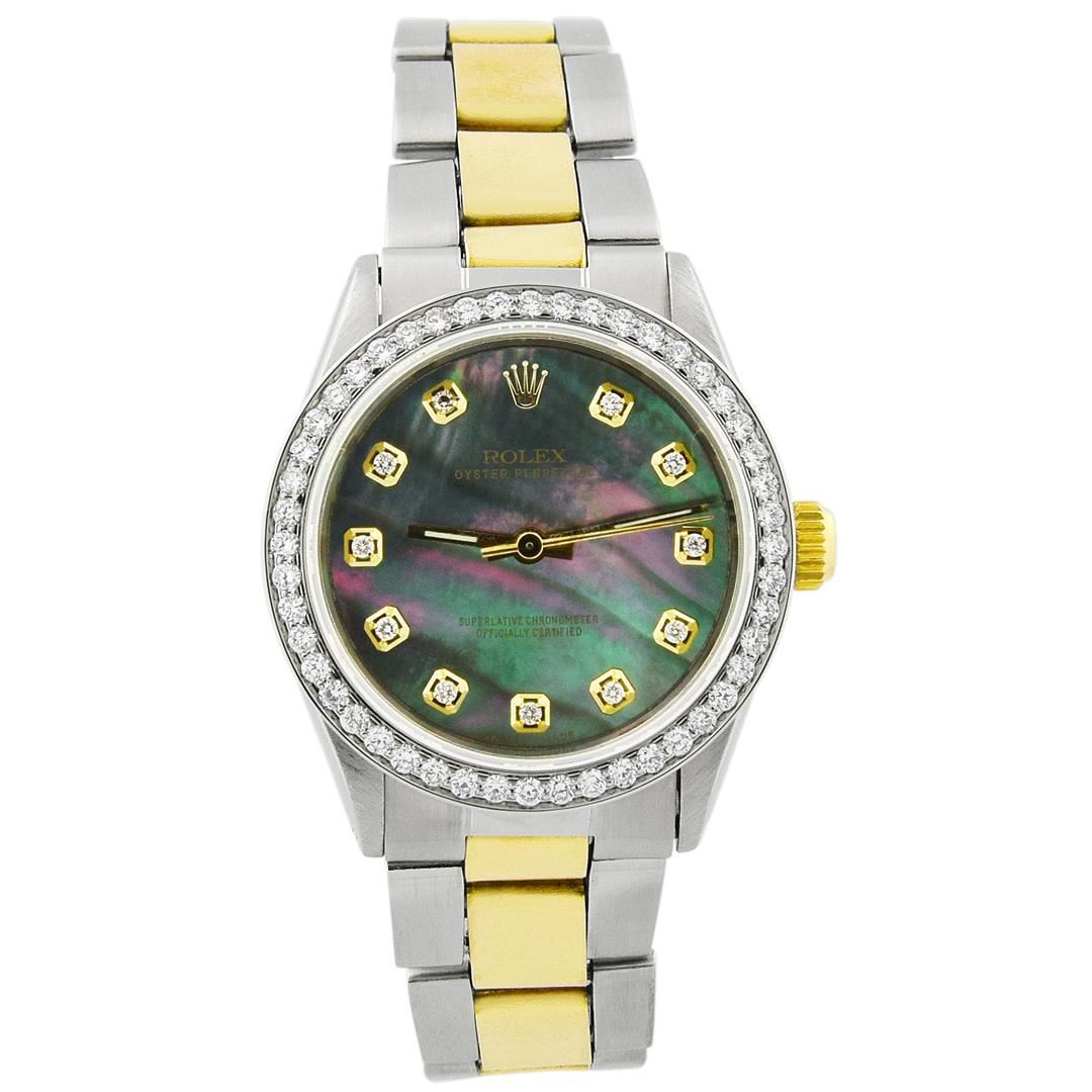 Rolex Lady Oyster Perpetual 18KT Yellow Gold & Stainless Steel 31mm Mother of Pearl Diamond Dial Watch Polished & Electronically Tested. Model: Oyster Perpetual. Case: 18KT Yellow Gold & Stainless Steel. Bezel: Custom made diamond bezel with round brilliant diamonds all set in prong setting. Total Diamond Weight: 0.85ctw. Clarity: VS-SI Color: G-H. Crystal: Sapphire Crystal. Bracelet: 18KT Yellow Gold & Stainless Steel, Adjustable Standard Clasp with Rolex Logo, Loose. Dial: Mother of Pearl Diamond Dial. Movement: Automatic Winding Movement. Water Resistant: Yes. Case Size: 31mm. Condition: Pre Owned, Watch is free of all Scratches and Dents, Extra Fine G-6.