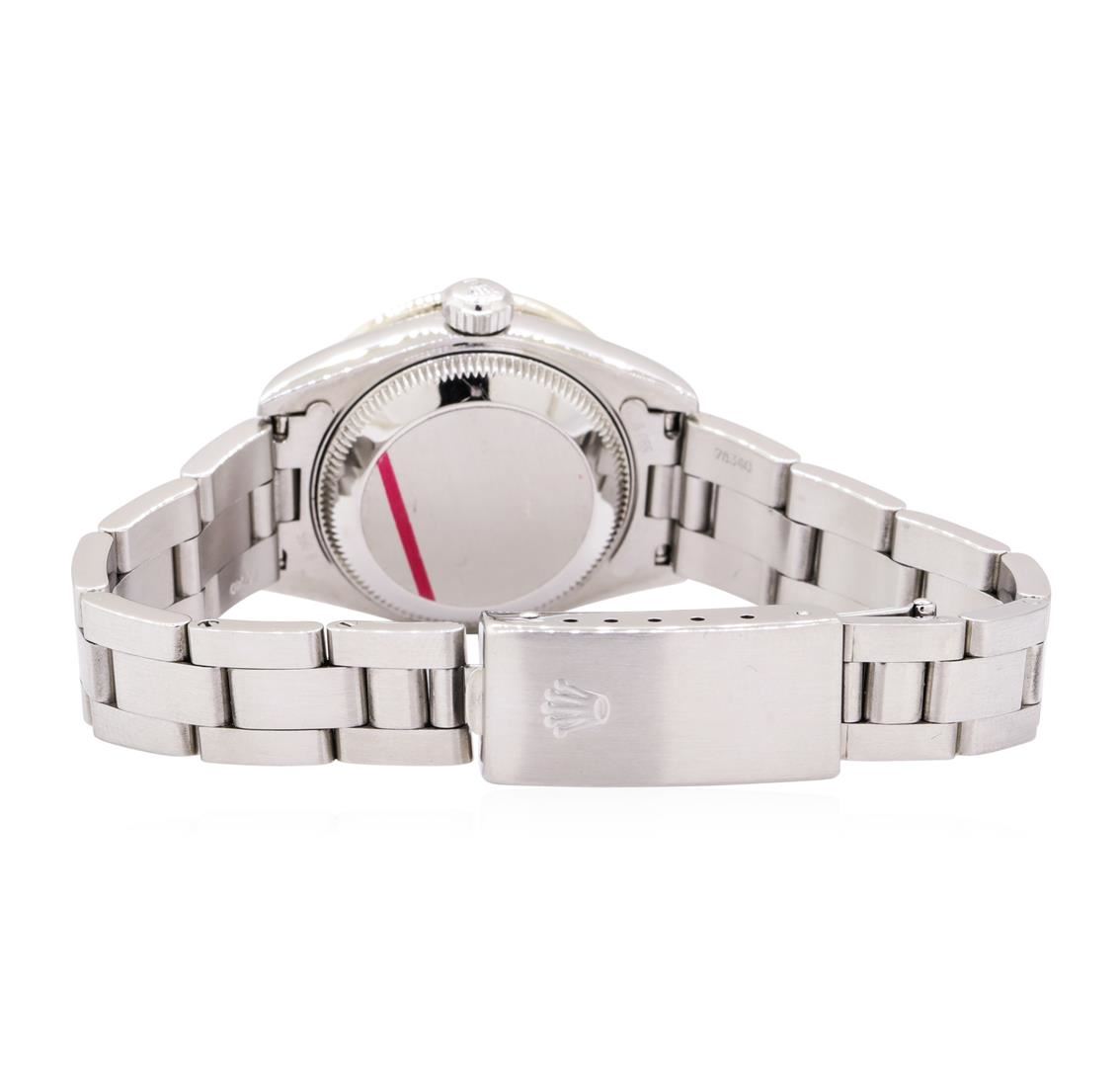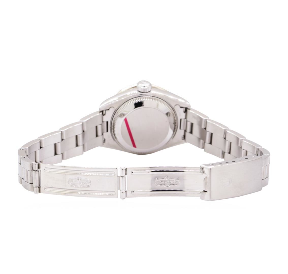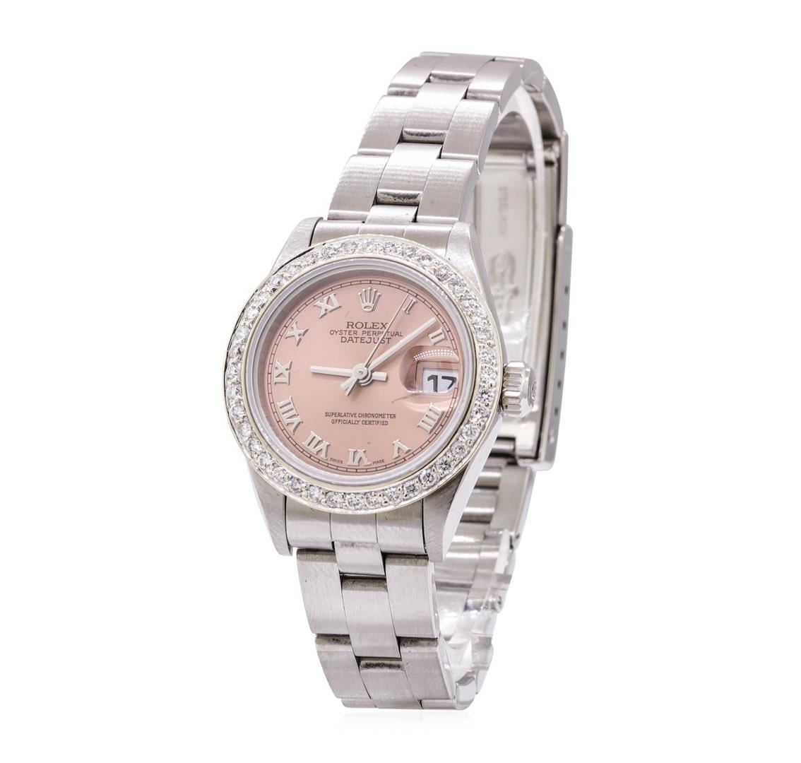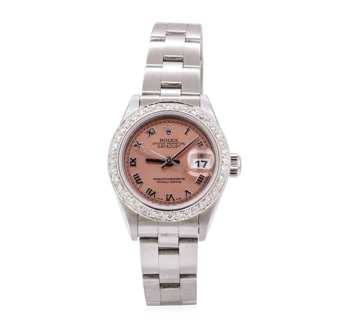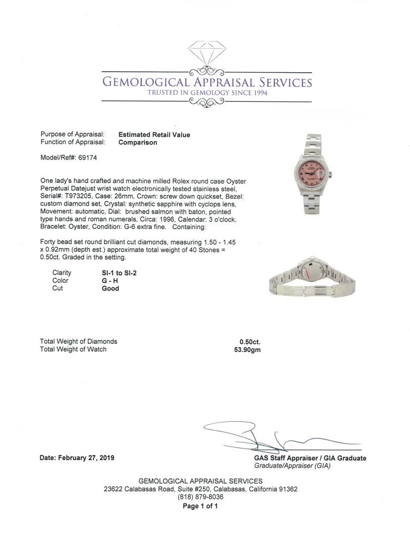 One lady's, hand crafted and machine milled Rolex round case Oyster Perpetual Datejust wrist watch electronically tested stainless steel, Serial#: T973205, Case: 26mm, Crown: screw down quickset, Bezel: custom diamond set, Crystal: synthetic sapphire with cyclops lens, Movement: automatic, Dial: brushed salmon with baton, pointed type hands and roman numerals, Circa: 1996, Calendar: 3 o'clock, Bracelet: Oyster, Condition: G-6 extra fine. Containing: Forty bead set round brilliant cut diamonds, measuring 1.50 - 1.45 x 0.92mm (depth est.) approximate total weight of 40 Stones = 0.50ct. Graded in the setting. Color G - H, Clarity SI-1 to SI-2, Cut Good. Total Weight of Diamonds 0.50ct. Total Weight of Watch 53.90gm. GAS Appraised.