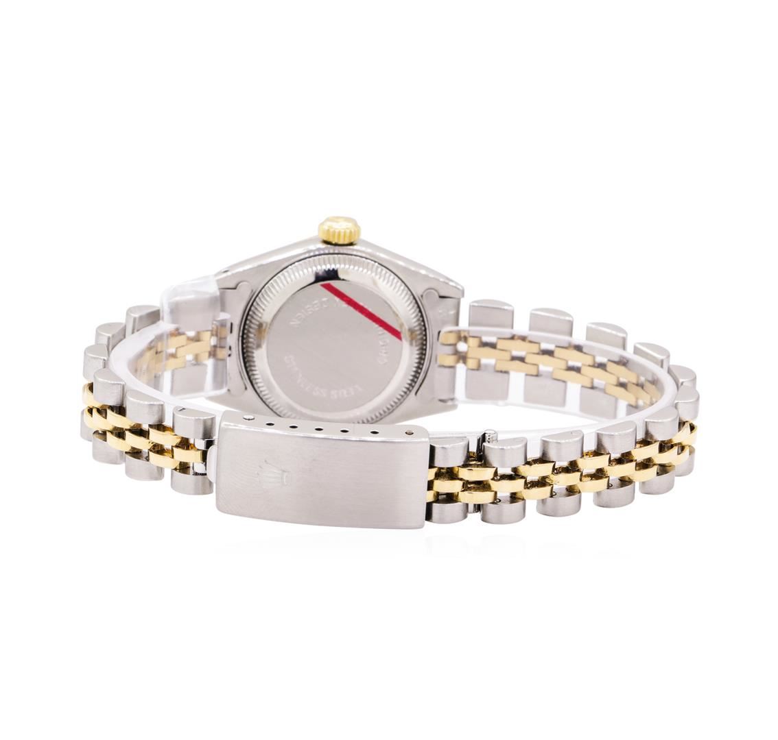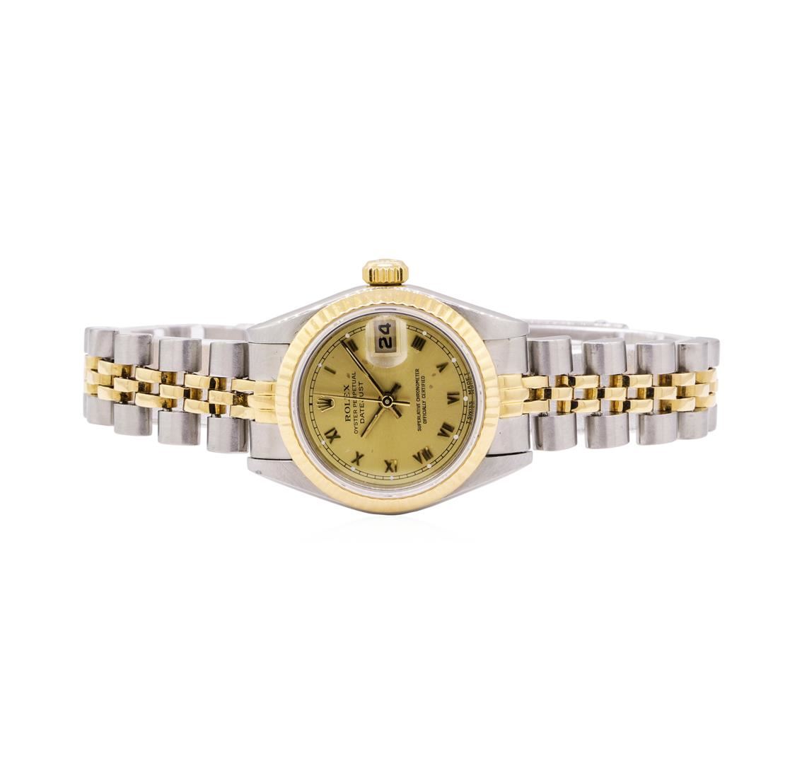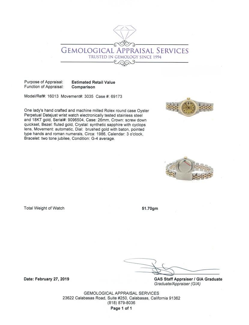One lady's, hand crafted and machine milled Rolex round case Oyster Perpetual Datejust wrist watch electronically tested stainless steel and 18KT gold, Serial#: 9096504, Case: 26mm, Crown: screw down quickset, Bezel: fluted gold, Crystal: synthetic sapphire with cyclops lens, Movement: automatic, Dial: brushed gold with baton, pointed type hands and roman numerals, Circa: 1986, Calendar: 3 o'clock, Bracelet: two tone jubilee, Condition: G-4 average. Total Weight of Watch 51.70gm. GAS Appraised.