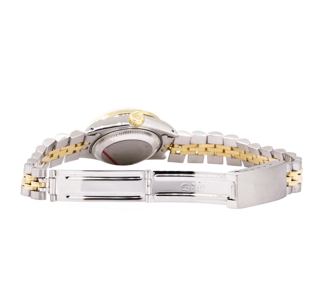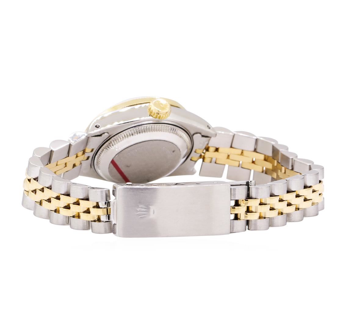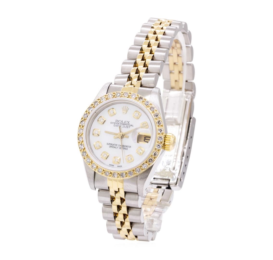 One lady's, hand crafted and machine milled Rolex round case Oyster Perpetual Datejust wrist watch electronically tested stainless steel and 18KT gold, Serial#: L751435, Case: 26mm, Crown: screw down quickset, Bezel: custom diamond set, Crystal: synthetic sapphire with cyclops lens, Movement: automatic, Dial: custom mother of pearl with baton, pointed type hands and diamond marker numerals, Circa: 1989, Calendar: 3 o'clock, Bracelet: two tone jubilee, Condition: G-5 fine. Containing: Thirty-Two bead set round brilliant cut diamonds, measuring 1.50 - 1.45 x 0.92mm (depth est.) approximate total weight of 32 Stones = 0.40ct. Graded in the setting. Color H - I, Clarity SI-2 to I-1, Cut Good. Total Weight of Diamonds 0.40ct. Total Weight of Watch 55.20gm. GAS Appraised.