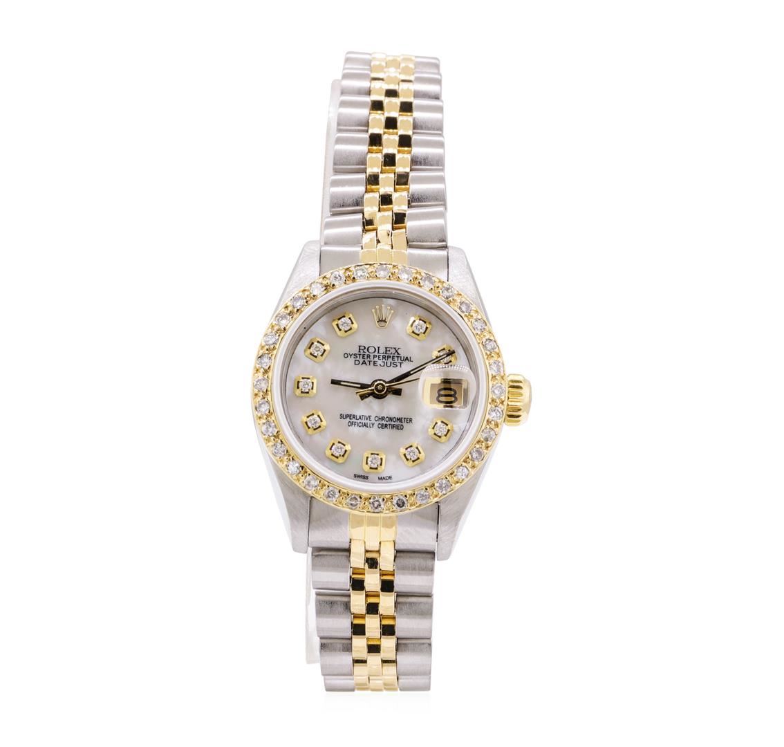 One lady's, hand crafted and machine milled Rolex round case Oyster Perpetual Datejust wrist watch electronically tested stainless steel and 18KT gold, Serial#: L751435, Case: 26mm, Crown: screw down quickset, Bezel: custom diamond set, Crystal: synthetic sapphire with cyclops lens, Movement: automatic, Dial: custom mother of pearl with baton, pointed type hands and diamond marker numerals, Circa: 1989, Calendar: 3 o'clock, Bracelet: two tone jubilee, Condition: G-5 fine. Containing: Thirty-Two bead set round brilliant cut diamonds, measuring 1.50 - 1.45 x 0.92mm (depth est.) approximate total weight of 32 Stones = 0.40ct. Graded in the setting. Color H - I, Clarity SI-2 to I-1, Cut Good. Total Weight of Diamonds 0.40ct. Total Weight of Watch 55.20gm. GAS Appraised.