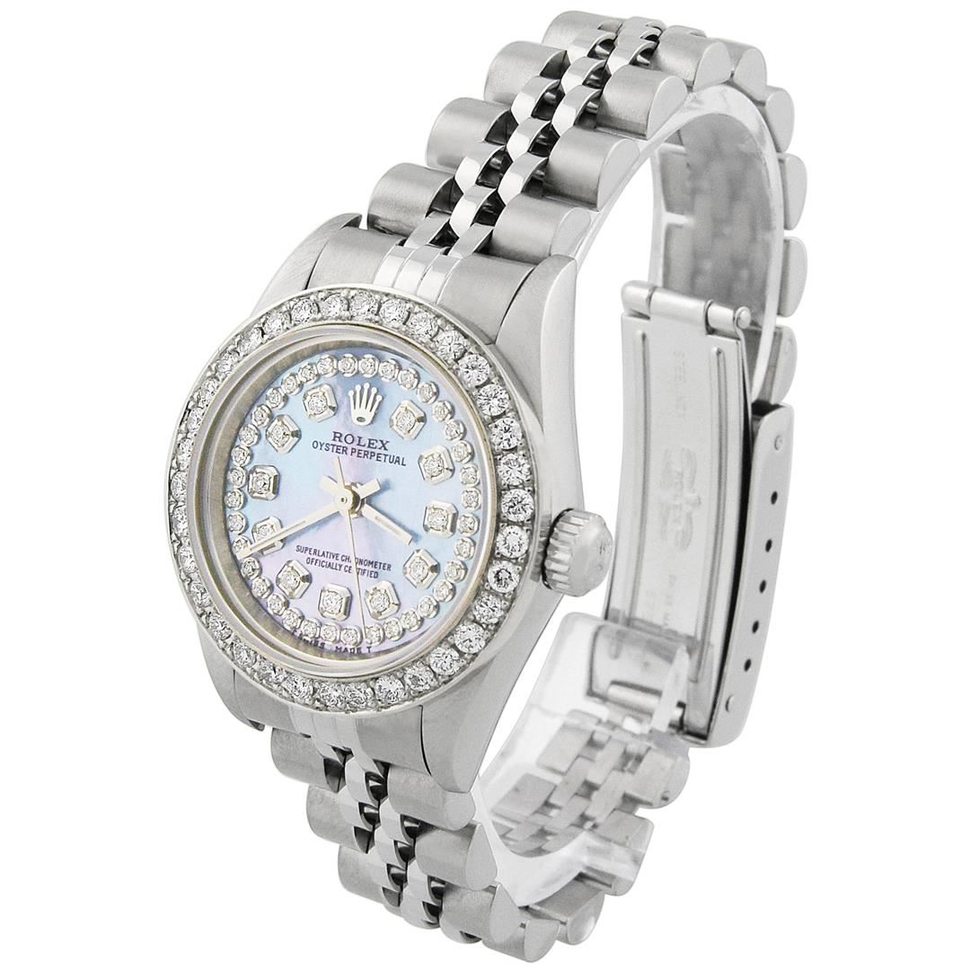 Rolex Lady Oyster Perpetual Stainless Steel 26mm Mother of Pearl Diamond Dial Watch Polished & Electronically Tested. Model: Oyster Perpetual. Case: Stainless Steel. Bezel: Custom made diamond bezel with round brilliant diamonds all set in prong setting. Total Diamond Weight: 0.85ctw. Clarity: VS-SI Color: G-H. Crystal: Sapphire Crystal. Bracelet: Stainless Steel, Loose, Adjustable Standard Clasp with Rolex Logo. Dial: Mother of Pearl Diamond Dial. Date Window: 3 O'clock Position. Movement: Automatic Winding Movement. Water Resistant: Yes. Case Size: 26mm. Condition: Pre Owned, Watch is free of all Scratches and Dents, Extra Fine G-6.