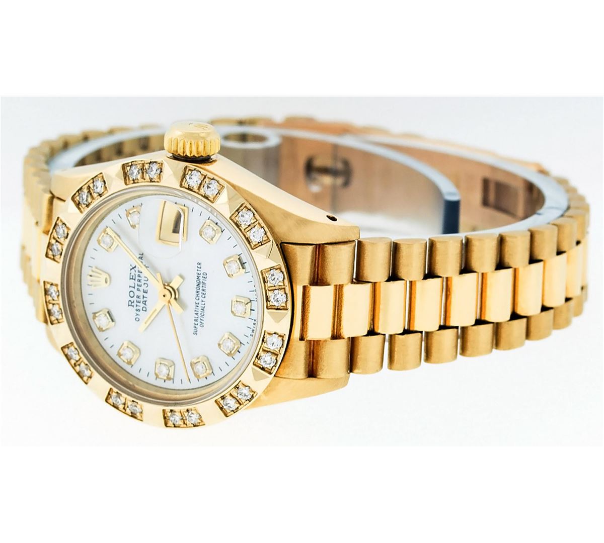 One Ladies 18K Rolex President Polished, Serviced & Electronically Tested, 18K Yellow Gold Case: 26mm, 18K Yellow Gold Crown, Custom Bezel: 18K Yellow Gold Pyramid Diamond Bezel, Diamond Count: 24 Diamonds In Dial. Total Weight .50 Carat, Clarity: SI-VS, Color: G to H. Custom Crystal: Synthetic Sapphire Cyclops Lens. Movement: Automatic Winding Movement Caliber 2030. Custom Dial: Mother Of Pearl Diamond Dial With Line Track, Diamond Count: 10 Diamonds In Dial, Clarity: SI-VS, Color: G To H. Date Window: 3 O'Clock Position, Model: Datejust President, Condition: G-6 Extra Fine The Watch Is In Very Good Condition Free Of All Scratches And Dents. Bracelet: 18K Yellow Gold President With Hidden Clasp, Bright & Satin Polish. 6.0 Inch Length, Standard President Clasp (Hidden Clasp), With Rolex Logo.