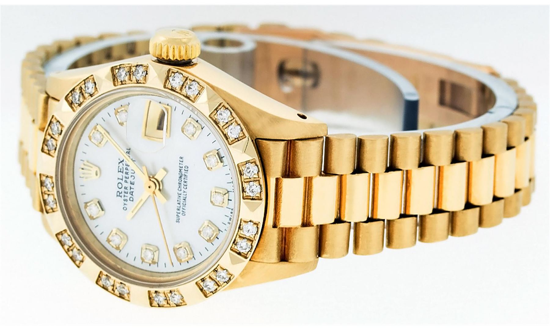 One Ladies 18K Rolex President Polished, Serviced & Electronically Tested, 18K Yellow Gold Case: 26mm, 18K Yellow Gold Crown, Custom Bezel: 18K Yellow Gold Pyramid Diamond Bezel, Diamond Count: 24 Diamonds In Dial. Total Weight .50 Carat, Clarity: SI-VS, Color: G to H. Custom Crystal: Synthetic Sapphire Cyclops Lens. Movement: Automatic Winding Movement Caliber 2030. Custom Dial: Mother Of Pearl Diamond Dial With Line Track, Diamond Count: 10 Diamonds In Dial, Clarity: SI-VS, Color: G To H. Date Window: 3 O'Clock Position, Model: Datejust President, Condition: G-6 Extra Fine The Watch Is In Very Good Condition Free Of All Scratches And Dents. Bracelet: 18K Yellow Gold President With Hidden Clasp, Bright & Satin Polish. 6.0 Inch Length, Standard President Clasp (Hidden Clasp), With Rolex Logo.