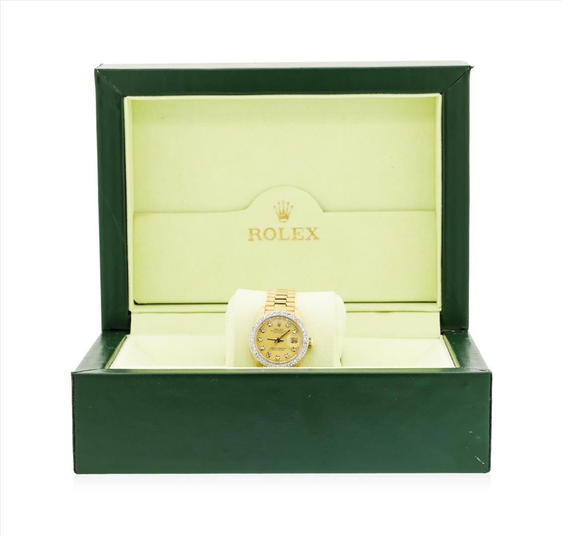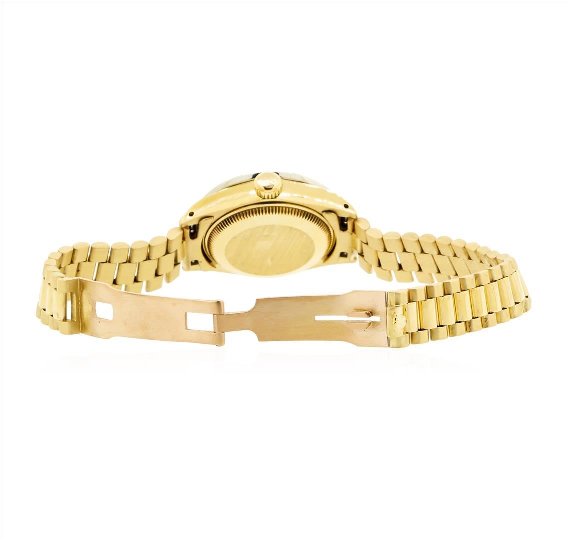 One ladies, hand crafted & machine milled Rolex Lady President the DateJust model wristwatch electronically tested 18KT yellow gold, Swiss Hallmarked Case: 26mm oyster, Rolex Signature Crown: twinlock with logo, Custom Bezel: diamond set, Crystal: acrylic cyclops lens. Circa: 1984.Automatic Movement: superlative chronometer, Rolex signed Customized Dial: Dark Champagne color, baton hands, & diamond markers, Date Display: 3 o'clock position, non-quick set, Rolex Bracelet: 18KT yellow gold Lady President, Condition: G-5 Fine. Bright polish finish. Six inch length. Swiss Hallmarked Rolex concealed deployment clasp, with logo. Containing: Forty-Three prong set round brilliant cut diamonds, approximate total weight of 43 Stones = 0.65ct. Graded in the setting. Clarity: VS-2 to S I-2. Color: F - H. Total Weight of Diamonds 0.65ct. Total Weight of Watch 65.83gm. AIG Appraised.