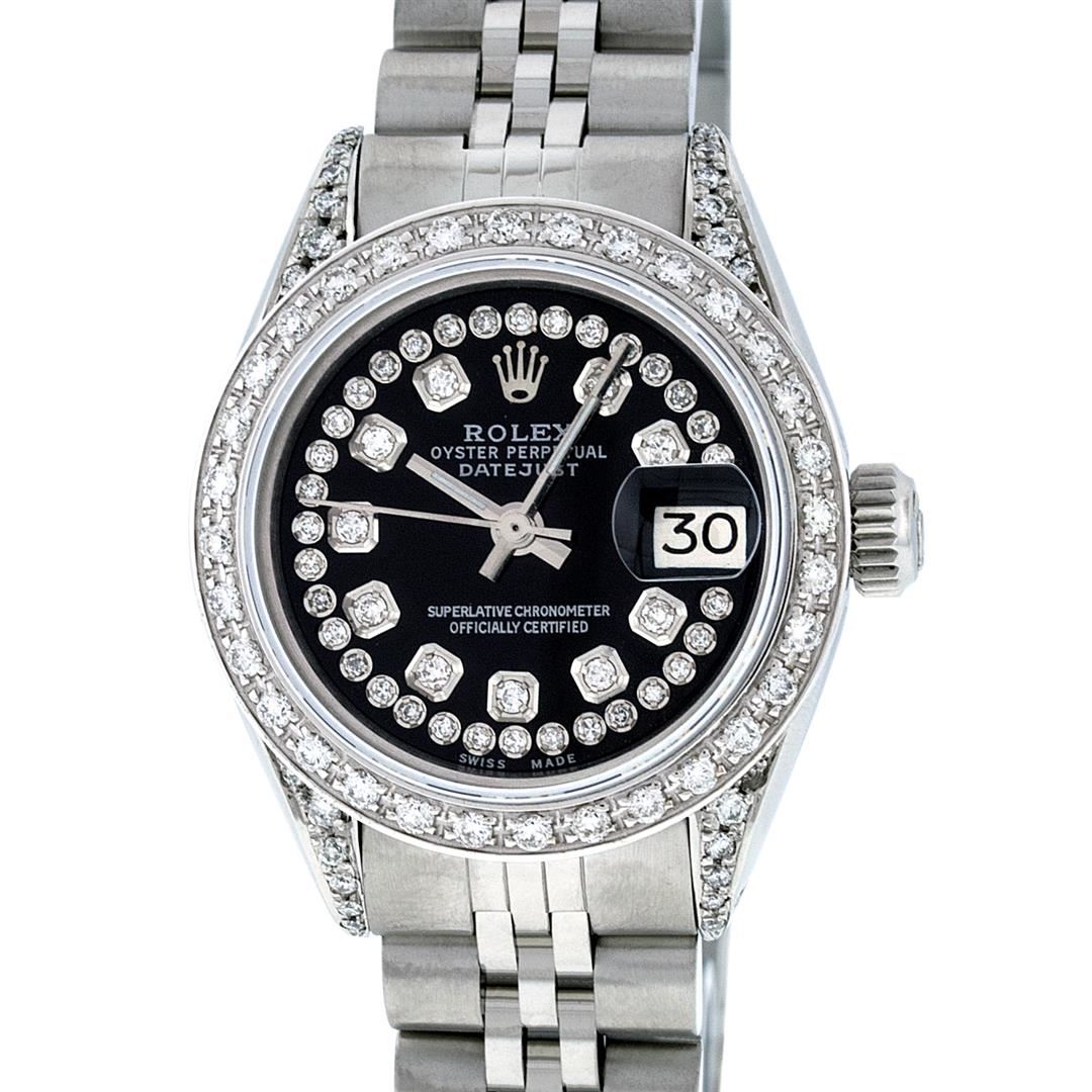 One Ladies Stainless Steel Rolex Datejust Polished Bright with Satin Finish, Serviced & Electronically Tested, Stainless Steel Case: 26mm, Stainless Steel Crown, Diamond Lugs: 24 Diamonds On Lugs, Clarity: SI-VS, Color: G to H. Custom Bezel: New 18K White Gold Beadset Diamond Bezel, Diamond Count: 32 Diamonds Total Weight 1.00 Carat, Clarity: SI-VS, Color: G to H. Custom Crystal: New Scratch Resistant Synthetic Sapphire Cyclops Lens. Custom Hands: New Luminescent Hands. Movement: Automatic Winding Movement. Custom Dial: Refinished Black With String Diamond Dial, 43 Diamonds in Dial G To H In Color, Clarity: SI-VS. Date Window: 3 O'clock Position Date Display, Model: Datejust. Condition: G-6 Extra Fine. Bracelet: Stainless Steel Jubilee. Bright Polish & Satin Finish. 6.0 Inch Length, Adjustable. Standard Clasp, With Rolex Logo. This Watch Has Been Serviced Time Tested And Is In Excellent Condition It Is Free Of All Scratches And Dents.