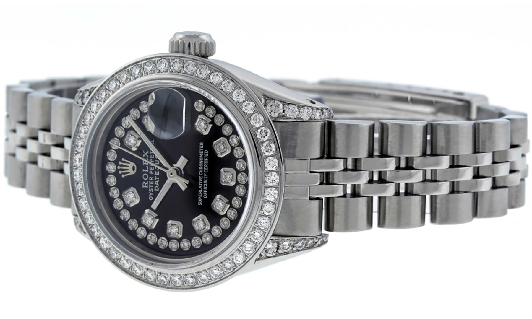 One Ladies Stainless Steel Rolex Datejust Polished Bright with Satin Finish, Serviced & Electronically Tested, Stainless Steel Case: 26mm, Stainless Steel Crown, Diamond Lugs: 24 Diamonds On Lugs, Clarity: SI-VS, Color: G to H. Custom Bezel: New 18K White Gold Beadset Diamond Bezel, Diamond Count: 32 Diamonds Total Weight 1.00 Carat, Clarity: SI-VS, Color: G to H. Custom Crystal: New Scratch Resistant Synthetic Sapphire Cyclops Lens. Custom Hands: New Luminescent Hands. Movement: Automatic Winding Movement. Custom Dial: Refinished Black With String Diamond Dial, 43 Diamonds in Dial G To H In Color, Clarity: SI-VS. Date Window: 3 O'clock Position Date Display, Model: Datejust. Condition: G-6 Extra Fine. Bracelet: Stainless Steel Jubilee. Bright Polish & Satin Finish. 6.0 Inch Length, Adjustable. Standard Clasp, With Rolex Logo. This Watch Has Been Serviced Time Tested And Is In Excellent Condition It Is Free Of All Scratches And Dents.
