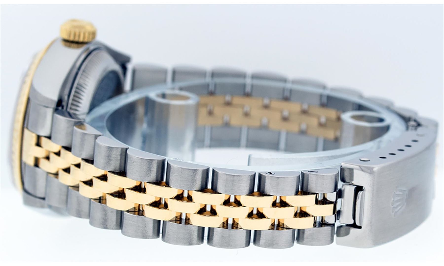 One Ladies 18K Two Tone Rolex Datejust Polished, Serviced & Electronically Tested, 18K Yellow Gold & Stainless Steel, Case Size: 26mm, 18K Yellow Gold Crown, Bezel: 18K Yellow Gold Fluted Bezel. Custom Crystal: New Acrylic Cyclops Lens. Custom Hands: New Luminescent Hands. Movement: Automatic Winding Movement Caliber 2235. Custom Dial: Mother Of Pearl Roman Dial With Square Track. Date Window: 3 O'Clock Position Date Display, Model: Datejust. Condition: G-6 Extra Fine. Bracelet: Two Tone 18K Yellow Gold & Stainless Steel Jubilee Band. Bright Polish. 6.0 Inch Length, Adjustable. Standard Clasp, With Rolex Logo. This Watch Has Been Serviced Time Tested And Is In Excellent Condition It Is Free Of All Scratches And Dents.