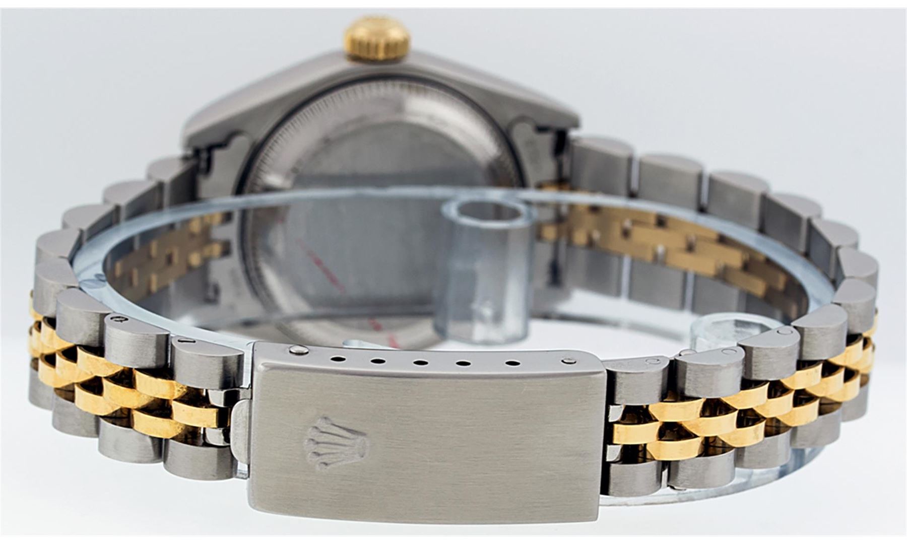 One Ladies 18K Two Tone Rolex Datejust Polished, Serviced & Electronically Tested, 18K Yellow Gold & Stainless Steel, Case Size: 26mm, 18K Yellow Gold Crown, Bezel: 18K Yellow Gold Fluted Bezel. Custom Crystal: New Acrylic Cyclops Lens. Custom Hands: New Luminescent Hands. Movement: Automatic Winding Movement Caliber 2235. Custom Dial: Mother Of Pearl Single Cut Diamond Dial, Diamond Count: 10 Diamonds In Dial, Color: G To H, Clarity VS2. Date Window: 3 O'Clock Position Date Display, Model: Datejust. Condition: G-6 Extra Fine. Bracelet: Two Tone 18K Yellow Gold & Stainless Steel Jubilee. Bright Polish. 6.0 Inch Length, Adjustable. Standard Clasp, With Rolex Logo. This Watch Has Been Serviced Time Tested And Is In Excellent Condition It Is Free Of All Scratches And Dents.