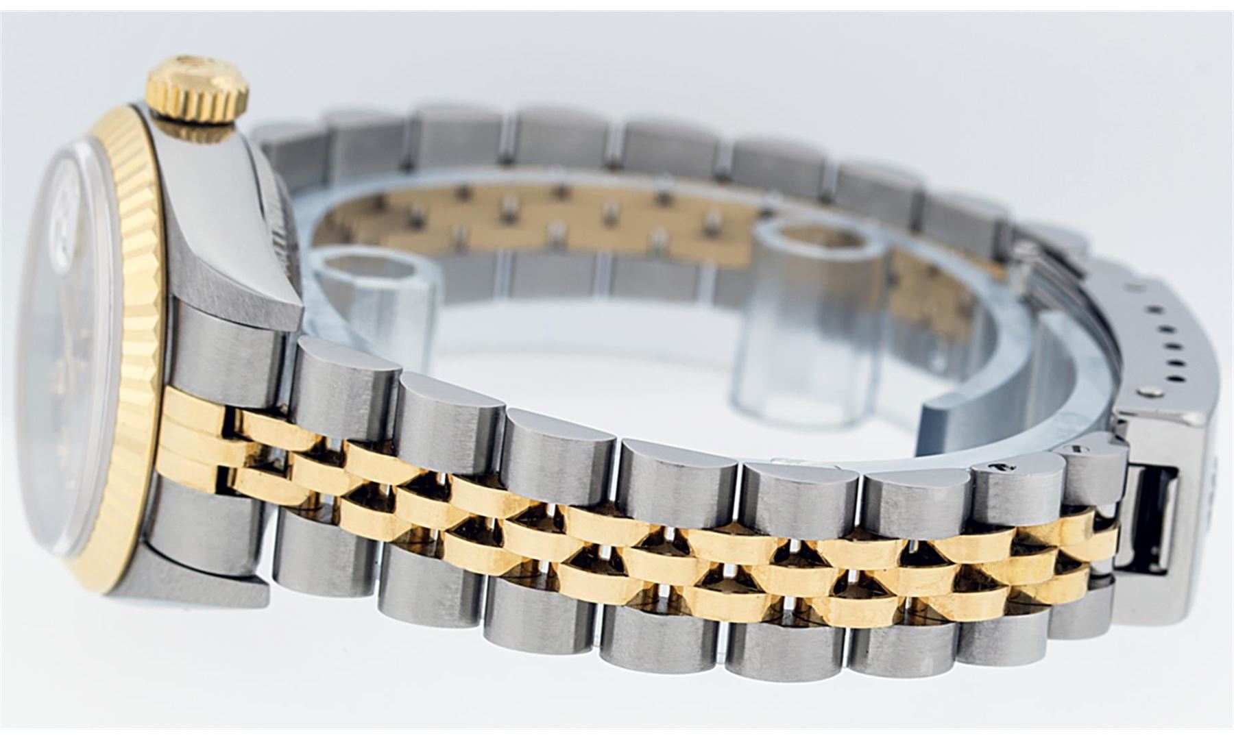 One Ladies 18K Two Tone Rolex Datejust Polished, Serviced & Electronically Tested, 18K Yellow Gold & Stainless Steel, Case Size: 26mm, 18K Yellow Gold Crown, Bezel: 18K Yellow Gold Fluted Bezel. Custom Crystal: New Acrylic Cyclops Lens. Custom Hands: New Luminescent Hands. Movement: Automatic Winding Movement Caliber 2235. Custom Dial: Mother Of Pearl Single Cut Diamond Dial, Diamond Count: 10 Diamonds In Dial, Color: G To H, Clarity VS2. Date Window: 3 O'Clock Position Date Display, Model: Datejust. Condition: G-6 Extra Fine. Bracelet: Two Tone 18K Yellow Gold & Stainless Steel Jubilee. Bright Polish. 6.0 Inch Length, Adjustable. Standard Clasp, With Rolex Logo. This Watch Has Been Serviced Time Tested And Is In Excellent Condition It Is Free Of All Scratches And Dents.