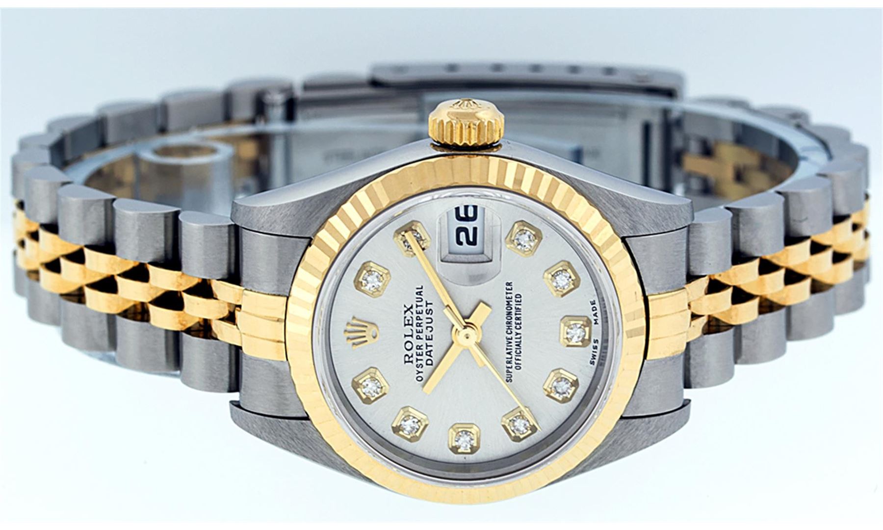 One Ladies 18K Two Tone Rolex Datejust Polished, Serviced & Electronically Tested, 18K Yellow Gold & Stainless Steel, Case Size: 26mm, 18K Yellow Gold Crown, Bezel: 18K Yellow Gold Fluted Bezel. Custom Crystal: New Acrylic Cyclops Lens. Custom Hands: New Luminescent Hands. Movement: Automatic Winding Movement Caliber 2235. Custom Dial: Silver Diamond Dial, Diamond Count: 10 Diamonds In Dial, Color: G To H, Clarity VS2. Date Window: 3 O'Clock Position Date Display, Model: Datejust. Condition: G-6 Extra Fine. Bracelet: Two Tone 18K Yellow Gold & Stainless Steel Jubilee. Bright Polish. 6.0 Inch Length, Adjustable. Standard Clasp, With Rolex Logo. This Watch Has Been Serviced Time Tested And Is In Excellent Condition It Is Free Of All Scratches And Dents.